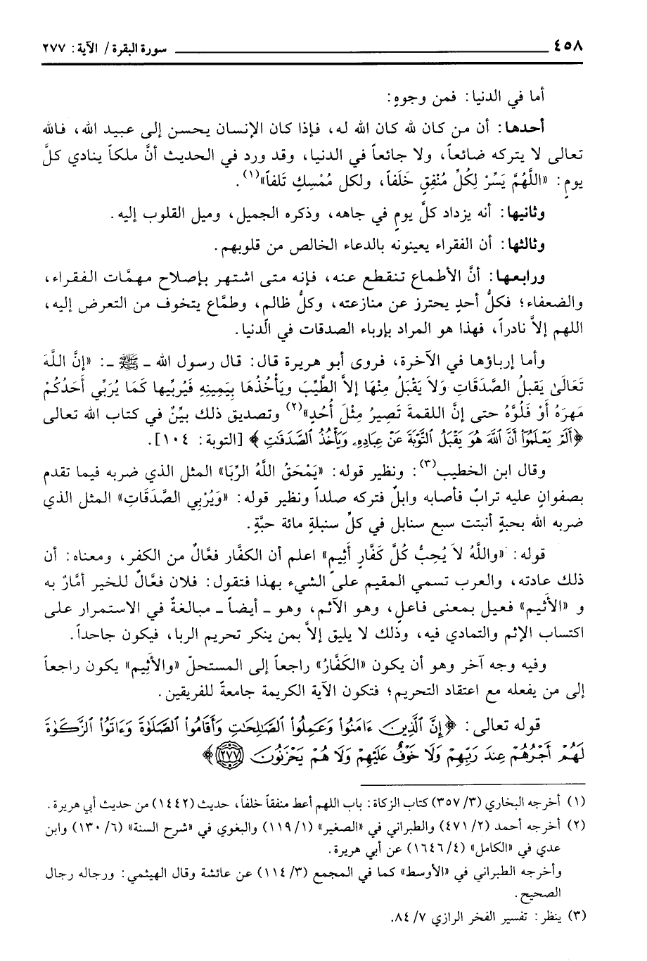 ورابعها: أنَّ الأطماع تنقطع عنه، فإنه متى اشتهر بإصلاح مهمَّات الفقراء، والضعفاء؛ فكلُّ أحدٍ يحترز عن منازعته، وكلُّ ظالم، وطمَّاع يتخوف من التعرض إليه، اللهم إلاَّ نادراً، فهذا هو المراد بإرباء الصدقات في الدنيا.