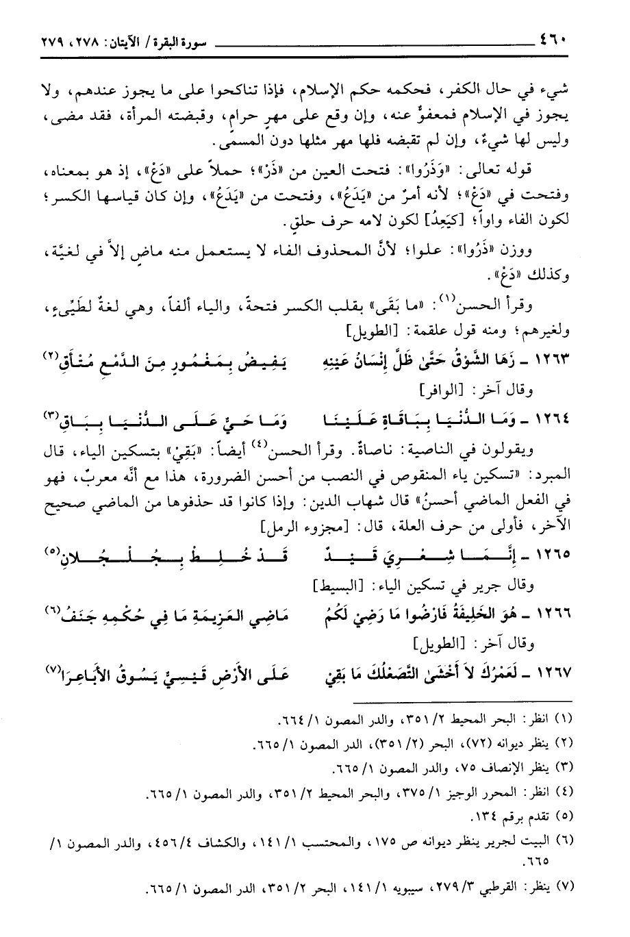 وقرأ الحسن: «مَا بَقَى» بقلب الكسر فتحةً، والياء ألفاً، وهي لغةٌ لطَيِّىءٍ، ولغيرهم؛ ومنه قول علقمة: [الطويل]