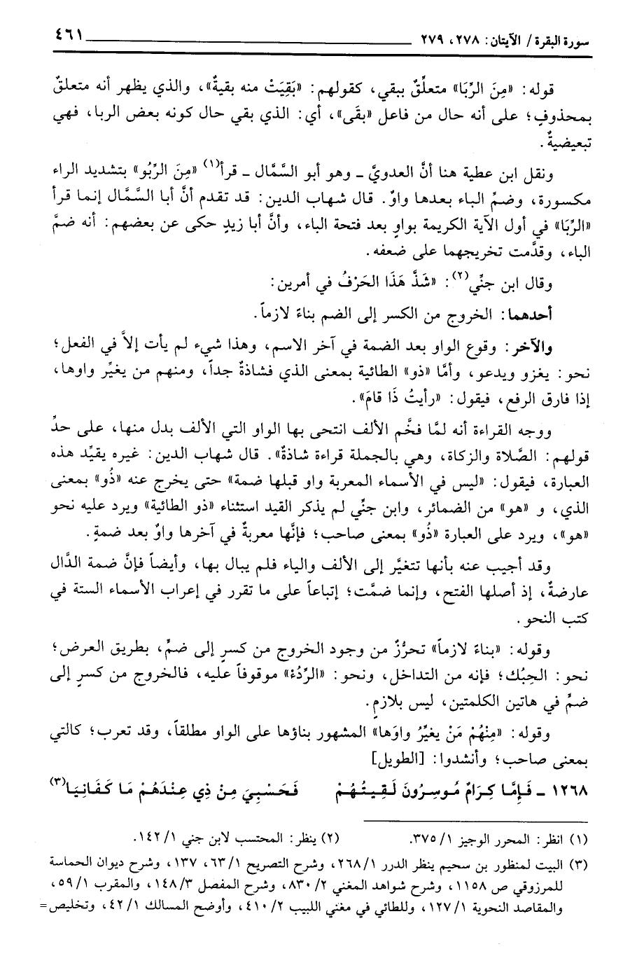 ووجه القراءة أنه لمَّا فخَّم الألف انتحى بها الواو التي الألف بدل منها، على حدِّ قولهم: الصَّلاة والزكاة، وهي بالجملة قراءة شاذةٌ» . قال شهاب الدين: غيره يقيِّد هذه العبارة، فيقول: «ليس في الأسماء المعربة واو قبلها ضمة» حتى يخرج عنه «ذُو» بمعنى الذي، و «هو» من الضمائر، وابن جنِّي لم يذكر القيد استثناء «ذو الطائية» ويرد عليه نحو «هو» ، ويرد على العبارة «ذُو» بمعنى صاحب؛ فإنَّها معربةٌ في آخرها واوٌ بعد ضمةٍ.
