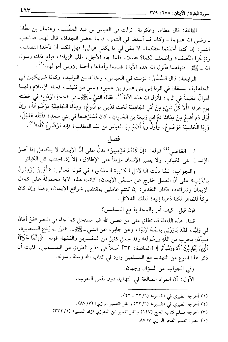 الرابعة: قال السُّدِّيُّ: نزلت في العباس، وخالد بن الوليد، وكانا شريكين في الجاهلية، يسلفان في الربا إلى بني عمرو بن عميرٍ، وناسٍ من ثقيف، فجاء الإسلام ولهما أموالٌ عظيمةٌ في الربا؛ فأنزل الله هذه الآية. فقال النبيُّ - صَلَّى اللَّهُ عَلَيْهِ وَسَلَّم َ - في «حجةِ الوَدَاعِ» في خطبته يوم عرفة «أَلاَ كُلُّ شَيْءٍ مِنْ أَمْرِ الجَاهِلِيَّةِ تَحْتَ قَدَمِي مَوْضُوعٌ، ودِمَاءُ الجَاهِلِيَّةِ مَوْضُوعَةٌ، وإنَّ أَوَّلَ دَم أَضَعُ مِنْ دِمَائِنَا دَمُ ابنِ رَبِيعَةَ بن الحَارِثِ، كان مُسْتَرْضِعاً في بني سعدٍ؛ فقَتَلَه هُذيْلٌ، وَرِبَا الجَاهِلِيَّةِ مَوْضُوعٌ، وأَوَلُّ رِباً أَضَعُ رِبَا العباسِ بنِ عَبْد المطلبِ؛ فإنه مَوْضُوعٌ كُلُّه» .