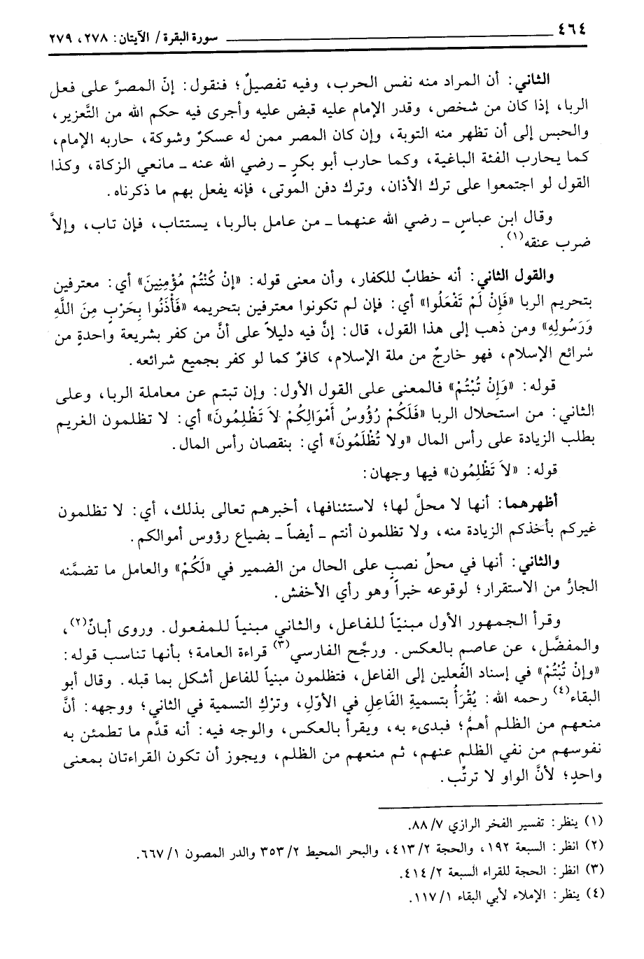 قوله: {وَإِنْ تُبْتُمْ} فالمعنى على القول الأول: وإن تبتم عن معاملة الربا، وعلى الثاني: من استحلال الربا {فَلَكُمْ رُؤُوسُ أَمْوَالِكُمْ لاَ تَظْلِمُونَ وَلاَ تُظْلَمُونَ} أي: لا تظلمون الغريم بطلب الزيادة على رأس المال {وَلاَ تُظْلَمُونَ} أي: بنقصان رأس المال.