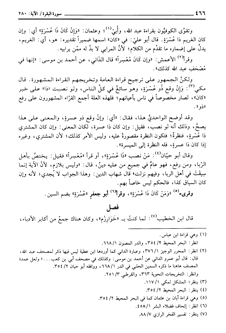 وقال أبو حيَّان: مَنْ نصب «ذَا عُسْرَةٍ» ، أو قرأ «مُعْسِراً» فقيل: يختصُّ بأهل الرِّبا، ومن رفع، فهو عامٌّ في جميع من عليه دينٌ، قال: «وليس بلازمٍ، لأنَّ الآية إنما سِيقَتْ في أهل الربا، وفيهم نزلت» قال شهاب الدين: وهذا الجواب لا يجدي؛ لأنه وإن كان السياق كذا، فالحكم ليس خاصاً بهم.