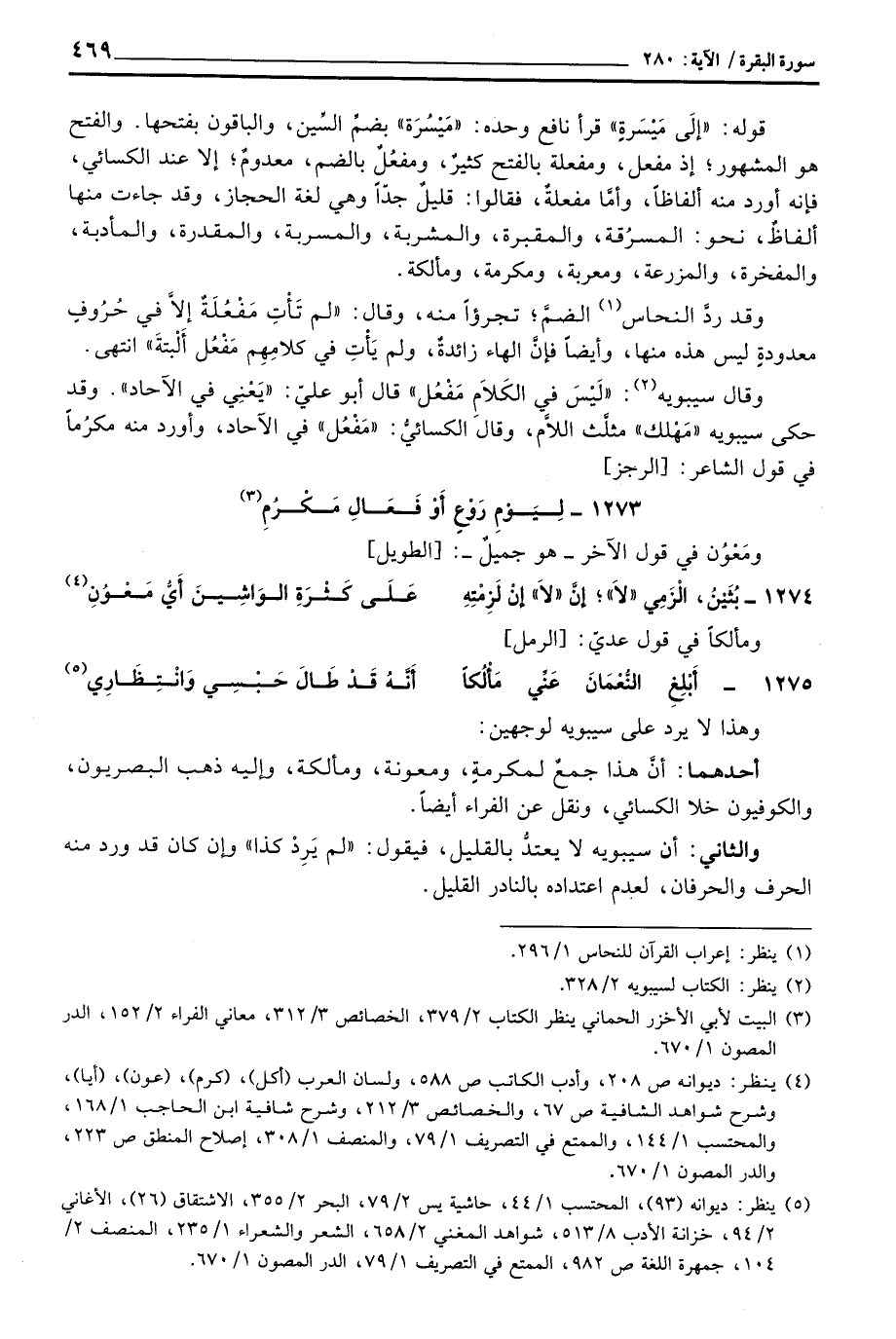 قوله: {إلى مَيْسَرَةٍ} قرأ نافع وحده: «مَيْسَرَة» بضمِّ السِّين، والباقون بفتحها. والفتح هو المشهور؛ إذ مفعل، ومفعلة بالفتح كثيرٌ، ومفعُلٌ بالضم، معدومٌ؛ إلا عند الكسائي، فإنه أورد منه ألفاظاً، وأمَّا مفعلةٌ، فقالوا: قليلٌ جدّاً وهي لغة الحجاز، وقد جاءت منها ألفاظٌ، نحو: المسرُقة، والمقبرة، والمشربة، والمسربة، والمقدرة، والمأدبة، والمفخرة، والمزرعة، ومعربة، ومكرمة، ومألكة.