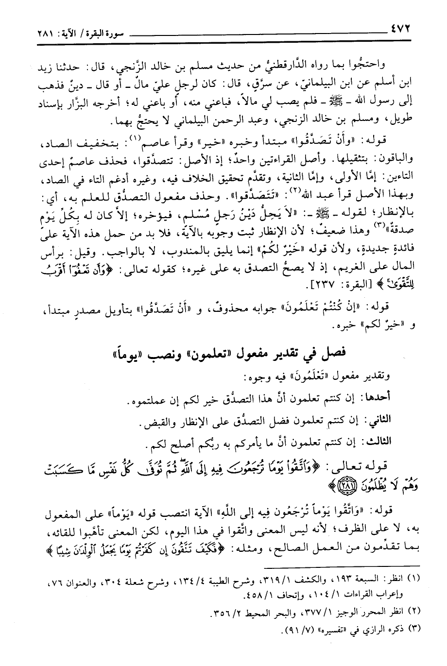 قوله: {واتقوا يَوْماً تُرْجَعُونَ فِيهِ إِلَى الله} الآية انتصب قوله «يَوْماً» على المفعول به، لا على الظرف؛ لأنه ليس المعنى واتَّقوا في هذا اليوم، لكن المعنى تأهَّبوا للقائه، بما تقدِّمون من العمل الصالح، ومثله: {فَكَيْفَ تَتَّقُونَ إِن كَفَرْتُمْ يَوْماً يَجْعَلُ الولدان شِيباً} [
