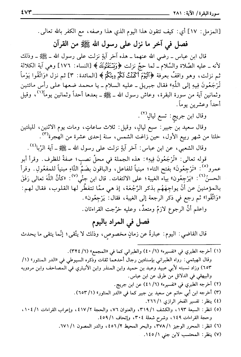 قال ابن عباس - رَضِيَ اللَّهُ عَنْهما - هذه آخر آيةٍ نزلت على رسول الله - صَلَّى اللَّهُ عَلَيْهِ وَسَلَّم َ - وذلك لأنه - عليه الصَّلاة والسَّلام - لما حجَّ نزلت {وَيَسْتَفْتُونَكَ} [النساء: 172] وهي آية الكلالة ثم نزلت، وهو واقفٌ بعرفة {اليوم أَكْمَلْتُ لَكُمْ دِينَكُمْ} [المائدة: 3] ثم نزل {واتقوا يَوْماً تُرْجَعُونَ فِيهِ إِلَى الله} فقال جبريل - عليه السلام - يا محمد ضعها على رأس مائتين وثمانين آية من سورة البقرة، وعاش رسول الله - صَلَّى اللَّهُ عَلَيْهِ وَسَلَّم َ - بعدها أحداً وثمانين يوماً، وقيل أحداً وعشرين يوماً.