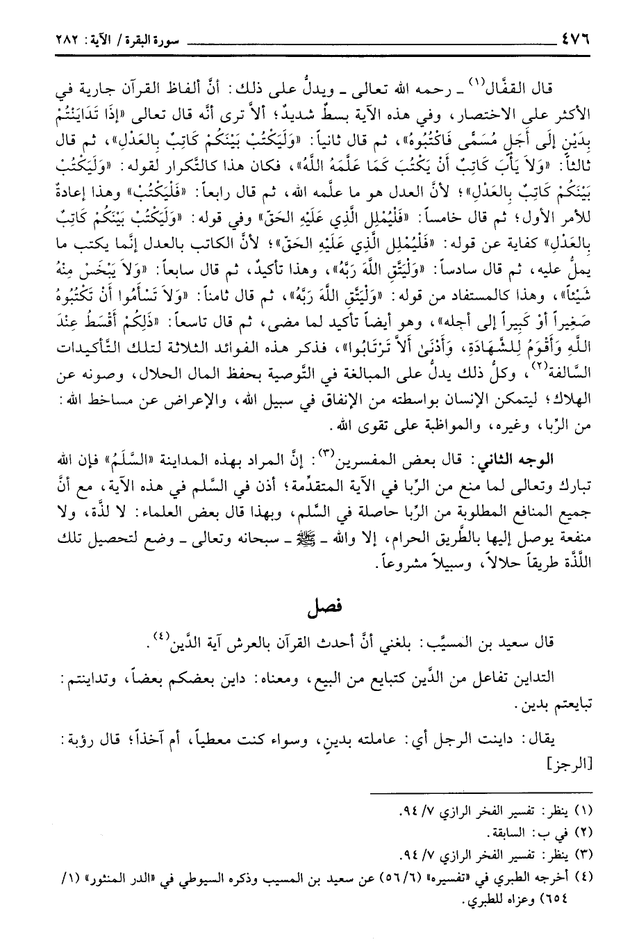 قال القفَّال - رَحِمَهُ اللَّهُ تعالى - ويدلُّ على ذلك: أنَّ ألفاظ القرآن جارية في الأكثر على الاختصار، وفي هذه الآية بسطٌ شديدٌ؛ ألاَّ ترى أنَّه قال تعالى {إِذَا تَدَايَنتُم بِدَيْنٍ إلى أَجَلٍ مُّسَمًّى فاكتبوه} ، ثم قال ثانياً: {وَلْيَكْتُب بَّيْنَكُمْ كَاتِبٌ بالعدل} ، ثم قال ثالثاً: {وَلاَ يَأْبَ كَاتِبٌ أَنْ يَكْتُبَ كَمَا عَلَّمَهُ الله} ، فكان هذا كالتِّكرار لقوله: {وَلْيَكْتُب بَّيْنَكُمْ كَاتِبٌ بالعدل} ؛ لأنَّ العدل هو ما علَّمه الله، ثم قال رابعاً: {فَلْيَكْتُبْ} وهذا إعادةٌ للأمر الأول؛ ثم قال خامساً: {وَلْيُمْلِلِ الذي عَلَيْهِ الحق} وفي قوله: {وَلْيَكْتُب بَّيْنَكُمْ كَاتِبٌ بالعدل} كفاية عن قوله: {وَلْيُمْلِلِ الذي عَلَيْهِ الحق} ؛ لأنَّ الكاتب بالعدل إنَّما يكتب ما يملُّ عليه، ثم قال سادساً: {وَلْيَتَّقِ الله رَبَّهُ} ، وهذا تأكيدٌ، ثم قال سابعاً: {وَلاَ يَبْخَسْ مِنْهُ شَيْئاً} ، وهذا كالمستفاد من قوله: {وَلْيَتَّقِ الله رَبَّهُ} ، ثم قال ثامناً: {وَلاَ تسأموا أَن تَكْتُبُوهُ صَغِيراً أَو كَبِيراً إلى أَجَلِهِ} ، وهو أيضاً تأكيد لما مضى، ثم قال تاسعاً: {ذَلِكُمْ أَقْسَطُ عِندَ الله وَأَقْومُ لِلشَّهَادَةِ وأدنى أَلاَّ ترتابوا} ، فذكر هذه الفوائد الثلاثة لتلك التَّأكيدات السَّالفة، وكلُّ ذلك يدلُّ على المبالغة في التَّوصية بحفظ المال الحلال، وصونه عن الهلاك؛ ليتمكن الإنسان بواسطته من الإنفاق في سبيل الله، والإعراض عن مساخط الله: من الرِّبا، وغيره، والمواظبة على تقوى الله.