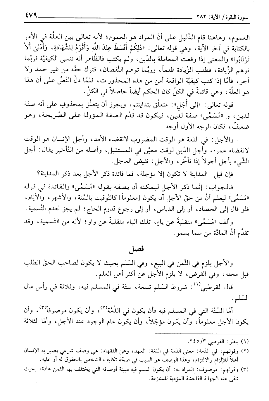 العموم، وها هنا قام الدَّليل على أنَّ المراد هو العموم؛ لأنه تعالى بين العلَّة في الأمر بالكتابة في آخر الآية، وهي قوله تعالى: {ذَلِكُمْ أَقْسَطُ عِندَ الله وَأَقْومُ لِلشَّهَادَةِ وأدنى أَلاَّ ترتابوا} والمعنى إذا وقعت المعاملة بالدّين، ولم يكتب فالظَّاهر أنه تنسى الكيفيَّة فربَّما توهم الزِّيادة، فطلب الزِّيادة ظلماً، وربَّما توهم النُّقصان، فترك حقَّه من غير حمد ولا أجر، فأمَّا إذا كتب كيفيَّة الواقعة أمن من هذه المحذورات، فلمَّا دلَّ النَّصُّ على أن هذا هو العلَّة، وهي قائمةٌ في الكلّ كان الحكم أيضاً حاصلاً في الكلِّ.