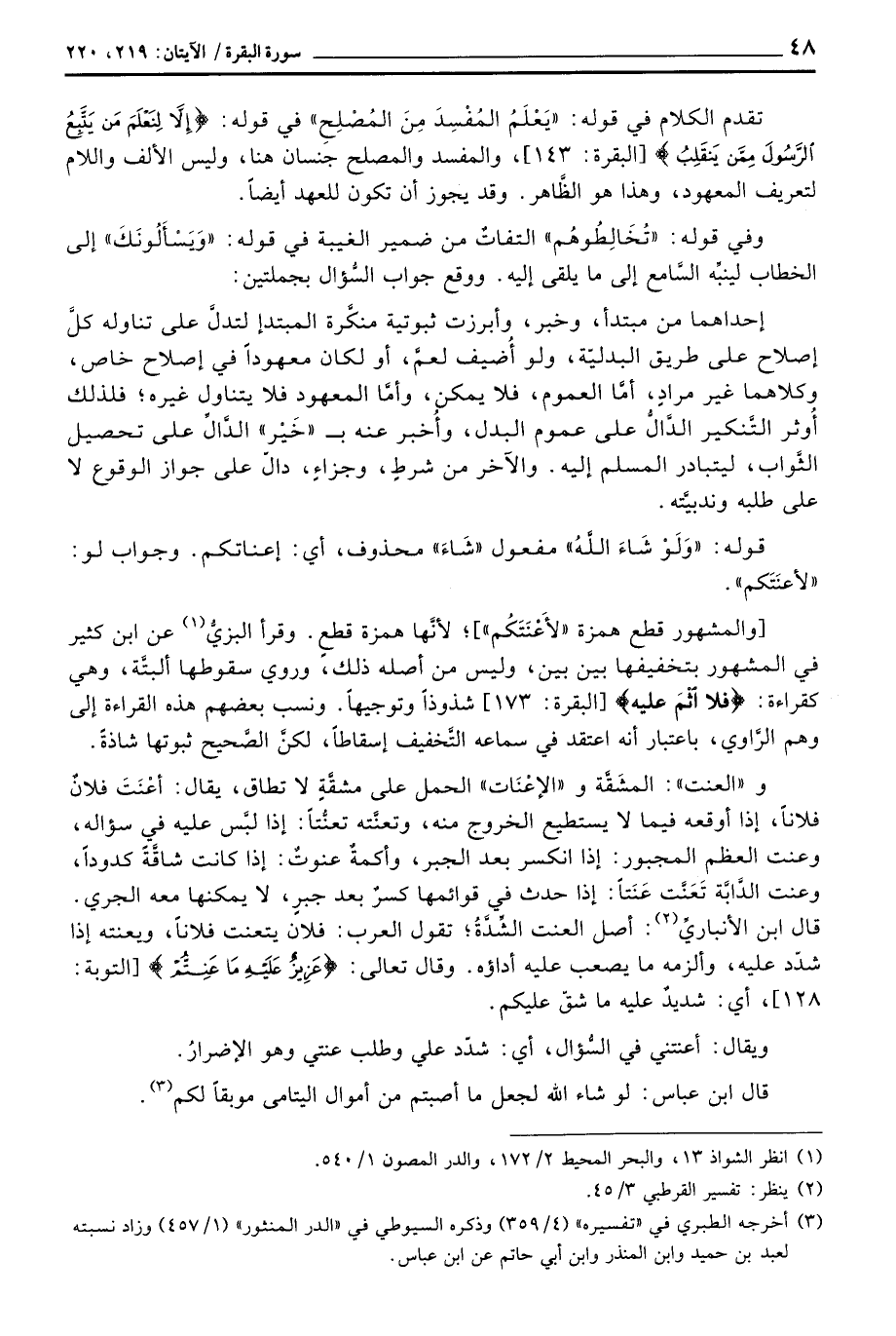 [والمشهور قطع همزة «لأَعْنَتَكُم» ] ؛ لأنَّها همزة قطعٍ. وقرأ البزيُّ عن ابن كثير في المشهور بتخفيفها بين بين، وليس من أصله ذلك، وروي سقوطها ألبتَّة، وهي كقراءة: {فلاا إِثْمَ عَلَيْهِ} [البقرة: 173] شذوذاً وتوجيهاً. ونسب بعضهم هذه القراءة إلى وهم الرَّاوي، باعتبار أنه اعتقد في سماعه التَّخفيف إسقاطاً، لكنَّ الصَّحيح ثبوتها شاذةً.