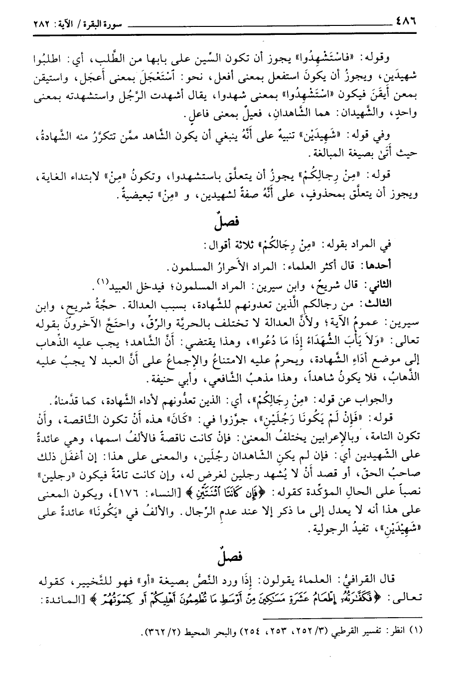 الثالث: من رجالكم الَّذين تعدونهم للشَّهادة، بسبب العدالة. حجَّةُ شريح، وابن سرين: عمومُ الآية؛ ولأَنَّ العدالة لا تختلف بالحريَّة والرِّقِّ، واحتَجَّ الآخرونَ بقوله تعالى: {وَلاَ يَأْبَ الشهدآء إِذَا مَا دُعُواْ} ، وهذا يقتضي: أَنَّ الشَّاهد؛ يجب عليه الذَّهاب إلى موضع أدَاءِ الشَّهادة، ويحرمُ عليه الامتناعُ والإِجماعُ على أَنَّ العبد لا يجبُ عليه الذَّهابُ، فلا يكونُ شاهداً، وهذا مذهبُ الشَّافعي، وأبي حنيفة.