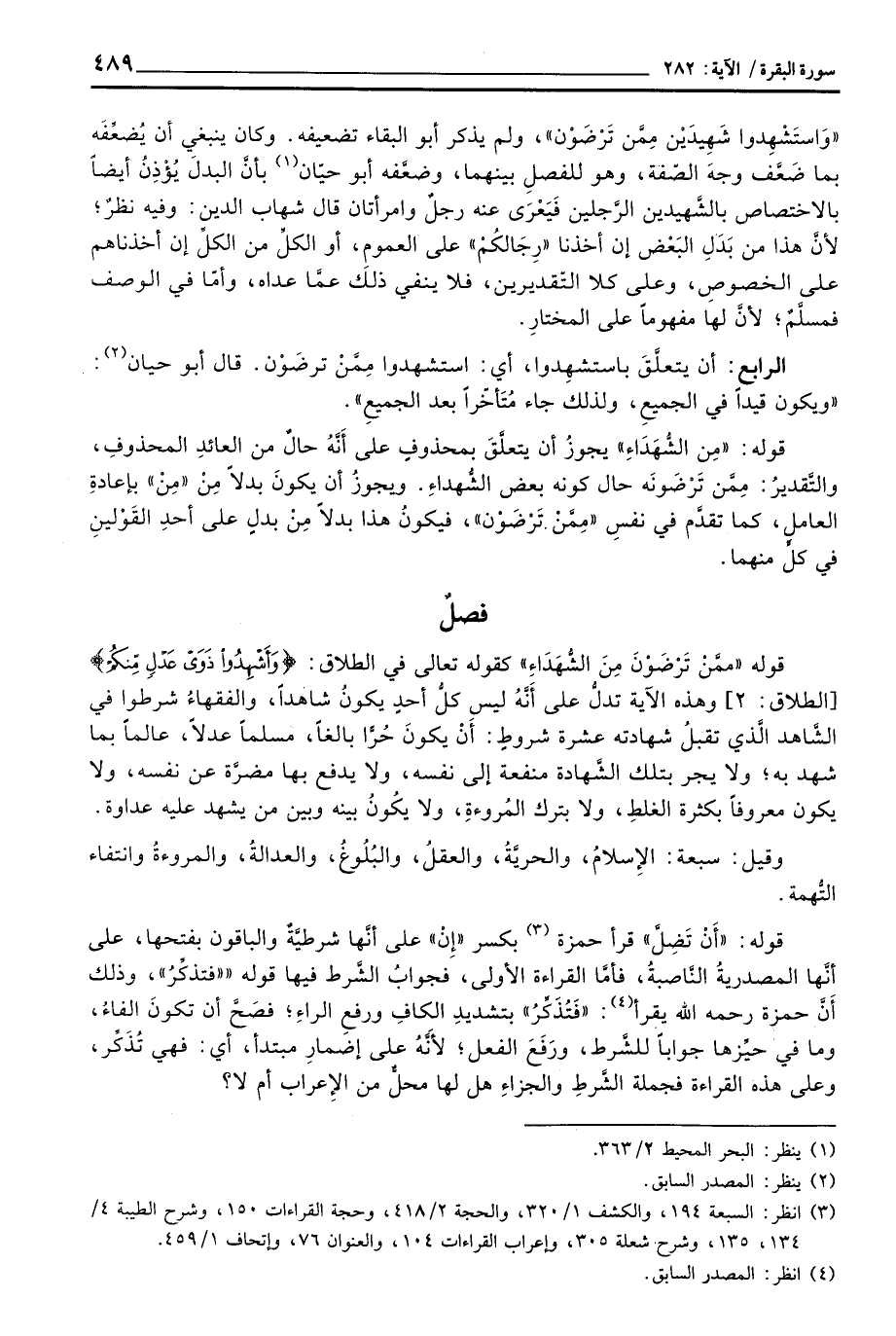وَاستَشْهِدوا شَهِيدَيْن مِمَّن تَرْضَوْن» ، ولم يذكر أبو البقاء تضعيفه. وكان ينبغي أن يُضعِّفَه بما ضَعَّف وجهَ الصّفة، وهو للفصلِ بينهما، وضعَّفه أبو حيّان بأنَّ البدلَ يُؤْذِنُ أيضاً بالاختصاص بالشَّهيدين الرَّجلين فَيَعْرَى عنه رجلٌ وامرأتان قال شهاب الدين: وفيه نظرٌ؛ لأنَّ هذا من بَدَلِ البَعْض إن أخذنا «رِجَالكُمْ» على العموم، أو الكلِّ من الكلِّ إن أخذناهم على الخصوصِ، وعلى كلا التّقديرين، فلا ينفي ذلك عمَّا عداه، وأمّا في الوصف فمسلَّمٌ؛ لأنَّ مفهوماً على المختارِ.
