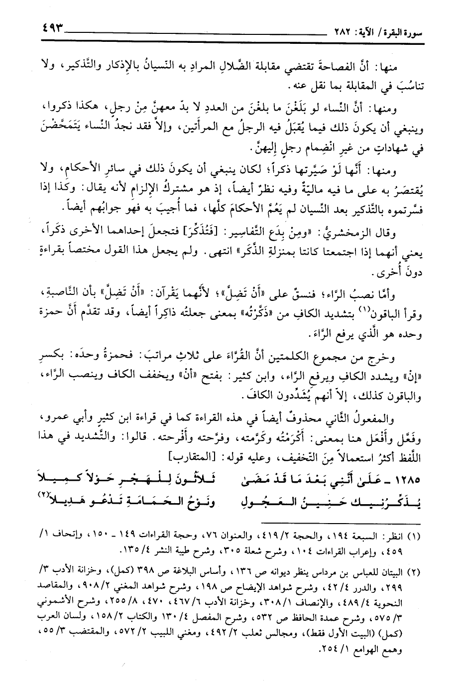 وأمَّا نصبُ الرَّاء؛ فنسقٌ على «أَنْ تَضِلَّ» ؛ لأَنَّهما يَقْرآن: «أَنْ تَضِلَّ» بأن النَّاصبةِ، وقرأ الباقون بتشديد الكافِ من «ذَكَّرْتُه» بمعنى جعلتُه ذاكِراً أيضاً، وقد تقدَّم أَنَّ حمزة وحده هو الَّذي يرفع الرَّاءَ.