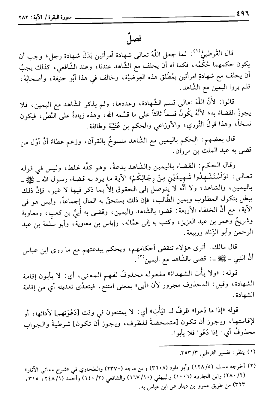 قال القُرطبيُّ: لما جعل اللهُ تعالى شهادة امرأتين بَدَلَ شهادة رجل؛ وجب أن يكون حكمهما حُكْمُه، فكما له أن يخلف مع الشَّاهد عندنا، وعند الشَّافعي، كذلك يجبُ أن يحلف مع شهادةِ امرأتين بمُطْلق هذه العِوضيَّة، وخالف في هذا أبُو حنيفة، وأصحابُهُ، فلم يروا اليمين مع الشَّاهد.