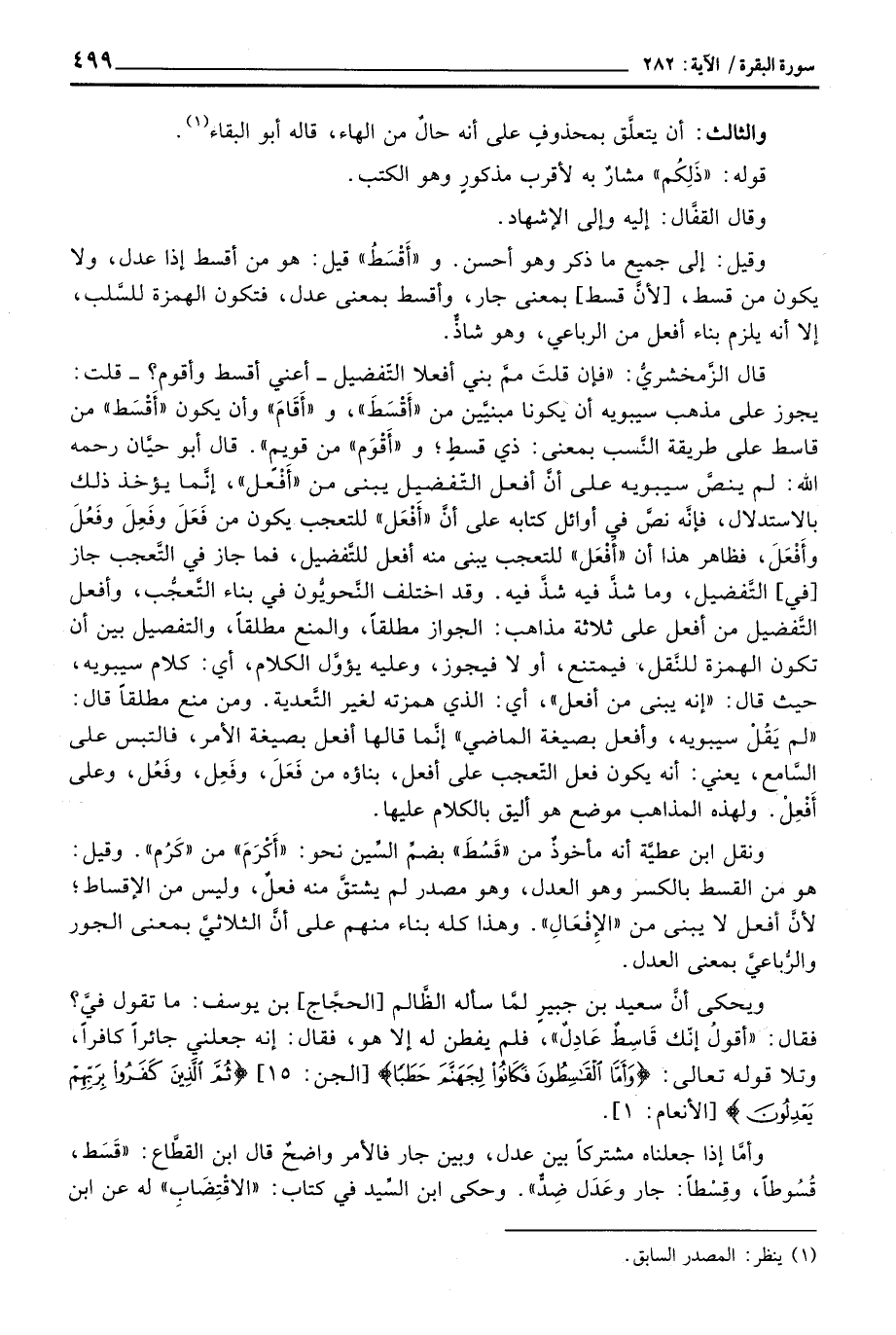 وقيل: إلى جميع ما ذكر وهو أحسن. و «أَقْسَطُ» قيل: هو من أقسط إذا عدل، ولا يكون من قسط، [لأن قسط] بمعنى جار، وأقسط بمعنى عدل، فتكون الهمزة للسَّلب، إلا أنه يلزم بناء أفعل من الرباعي، وهو شاذٌّ.
