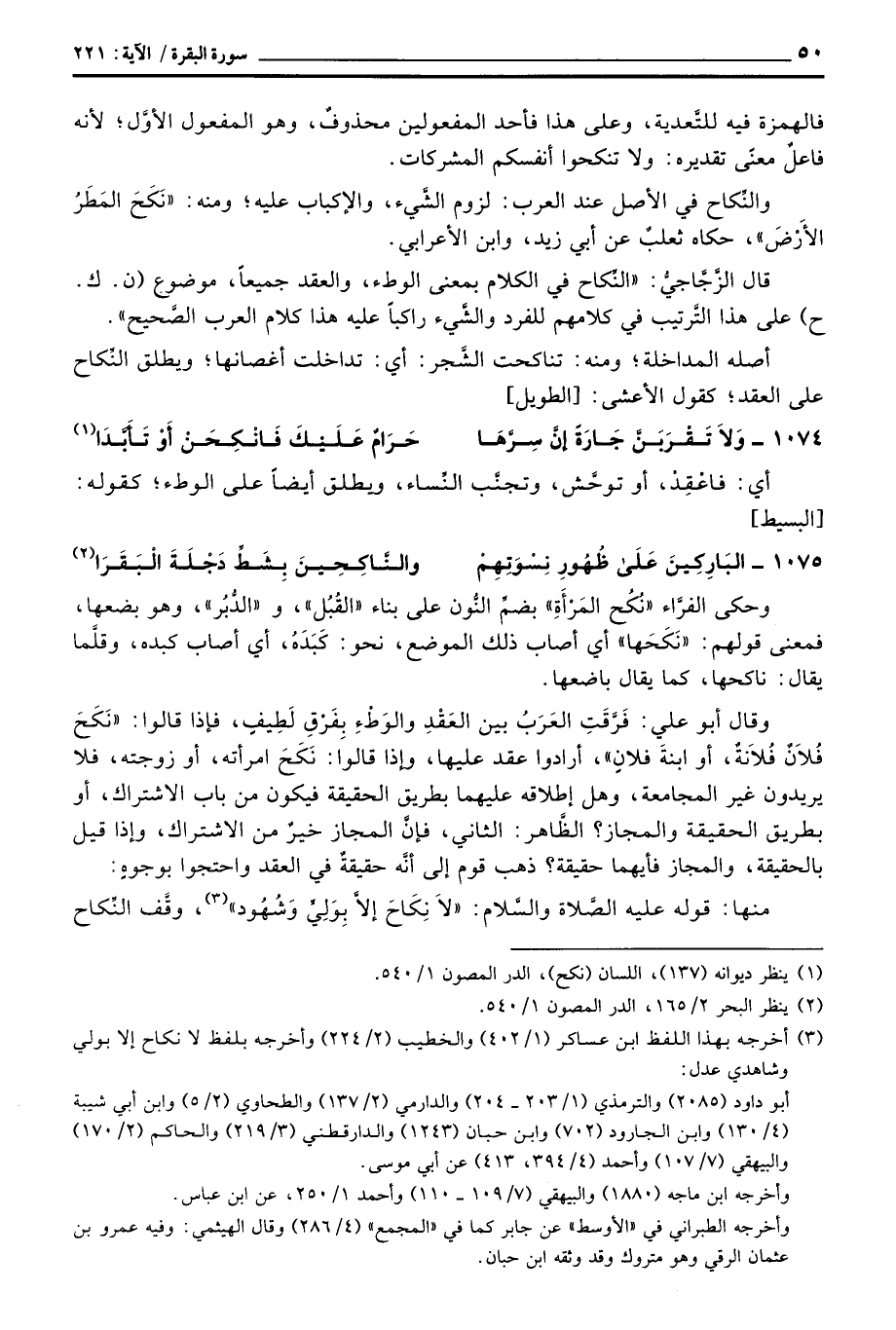 أصله المداخلة؛ ومنه: تناكحت الشَّجر: أي: تداخلت أغصانها؛ ويطلق النِّكاح على العقد؛ كقول الأعشى: [الطويل]