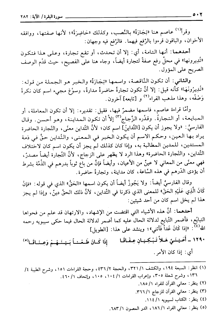والثاني: أن تكون النَّاقصة، واسمها «تِجَارَةٌ» والخبر هو الجملة من قوله: «تُدِيرُونَهَا» كأنه قيل: إلا أنَّ تكون تجارةٌ حاضرةٌ مدارةٌ، وسوَّغ مجيء اسم كان نكرةً وَصْفُه، وهذا مذهب الفراء و [تابعه] آخرون.