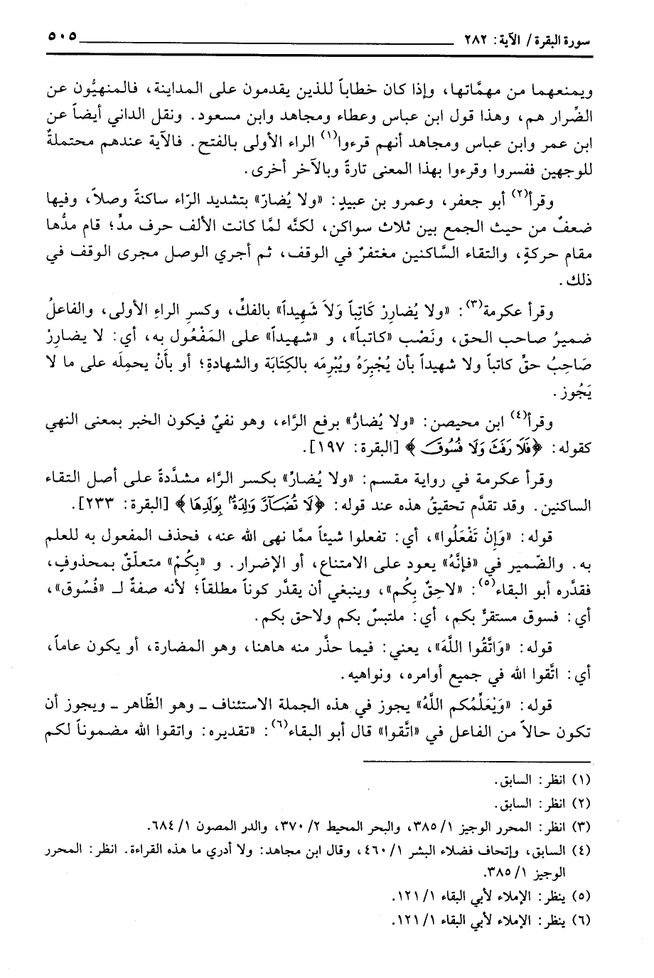 ويمنعهما من مهمَّاتها، وإذا كان خطاباً للذين يقدمون على المداينة، فالمنهيُّون عن الضِّرار هم، وهذا قول ابن عباس وعطاء ومجاهد وابن مسعود. ونقل الداني أياضً عن ابن عمر وابن عباس ومجاهد أنهم قرءوا الراء الأولى بالفتح. فالآية عندهم محتملةٌ للوجهين ففسروا وقرءوا بهذا المعنى تارةً وبالآخر أخرى.