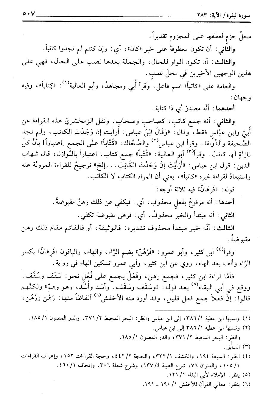 والثاني: أنه جمع كاتبٍ، كصاحبٍ وصحاب. ونقل الزمخشريُّ هذه القراءة عن أُبيّ وابن عبَّاسٍ فقط، وقال: «وَقَالَ ابْنُ عباس: أرأيت إن وَجَدْتَ الكاتب، ولم تجد الصَّحيفة والدَّواة» . وقرأ ابن عباس والضَّحَّاك: «كُتَّاباً» على الجمع [اعتباراً] بأنَّ كلَّ نازلةٍ لها كاتبٌ. وقرأ أبو العالية: «كُتُباً» جمع كتاب، اعتباراً بالنَّوازل، قال شهاب الدين: قول ابن عباس: «أَرَأَيْتَ إِنْ وَجَدْتَ الكَاتِبَ ... إلخ» ترجيحٌ للقراءة المرويَّة عنه واستبعادٌ لقراءة غيره «كاتباً» ، يعني أن المراد الكتاب لا الكاتب.