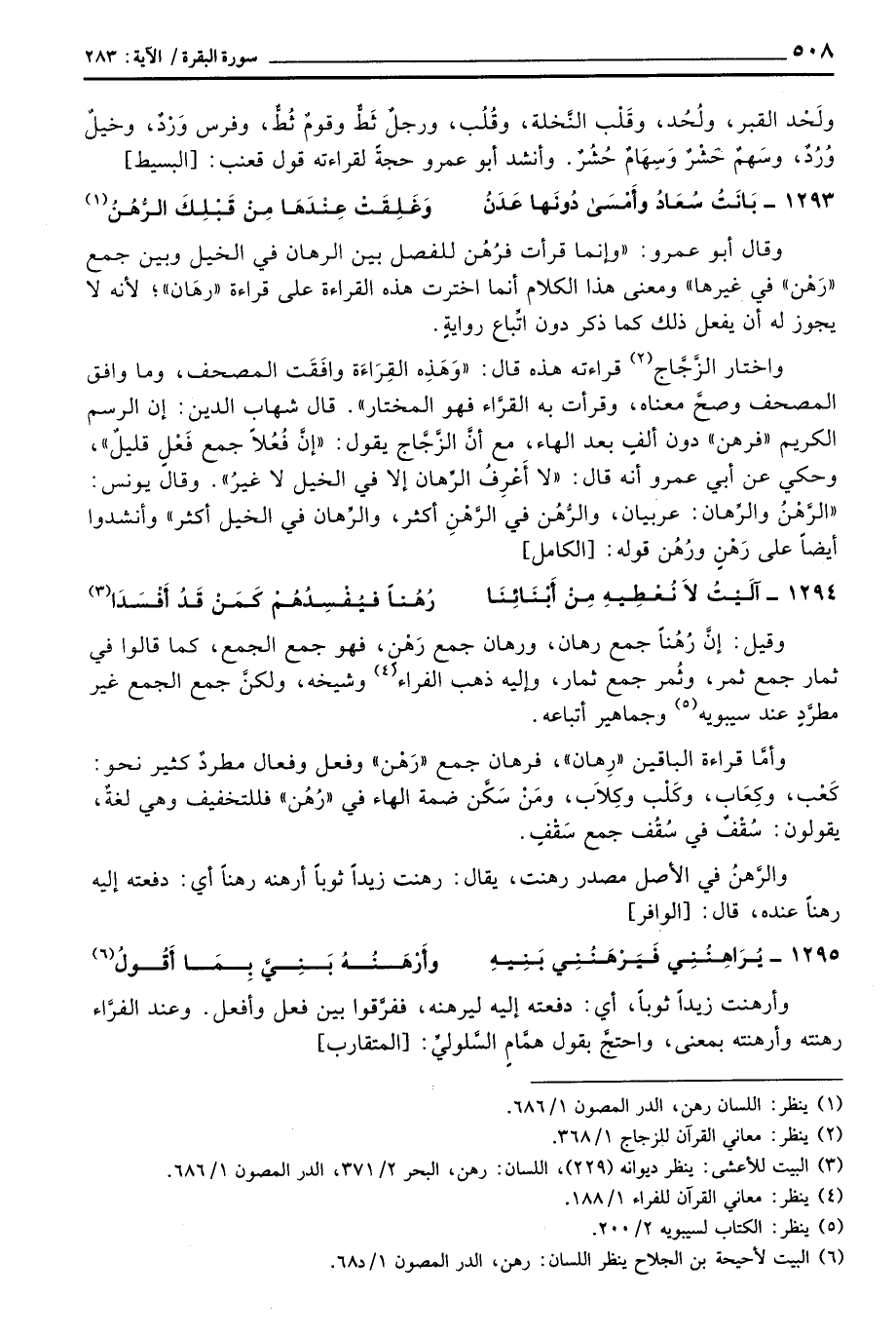 واختار الزَّجَّاج قراءته هذه قال: «وَهَذِه القِرَاءَة وافَقَت المصحف، وما وافق المصحف وصحَّ معناه، وقرأ به القرَّاء فهو المختار» . قال شهاب الدين: إن الرسم الكريم «فرهن» دون ألفٍ بعد الهاء، مع أنَّ الزَّجَّاج يقول: «إنَّ فُعُلاً جمع فَعْلٍ قليلٌ» ، وحكي عن أبي عمرو أنه قال: «لا أَعْرِفُ الرَّهان أكثر، والرِّهان في الخيل أكثر» وأنشدوا أيضاً على رَهْنٍ ورُهُن قوله: [الكامل]