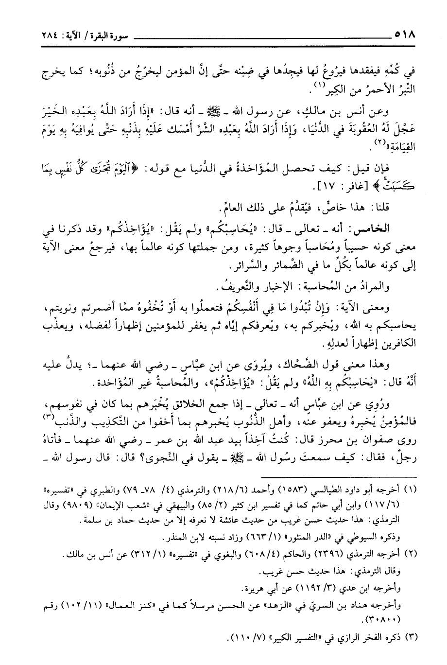 ومعنى الآية: وَإِنْ تُبْدُوا مَافِي أَنْفُسِكُمْ فتعملُوا به أَوْ تُخْفُوهُ ممَّا أضمرتم ونويتم، يحاسبكم به الله، ويُخبركم به، ويُعرفكم إيَّاه ثم يغفر للمؤمنين إظهاراً لفضله، ويعذِّب الكافرين إظهاراً لعدلِهِ.