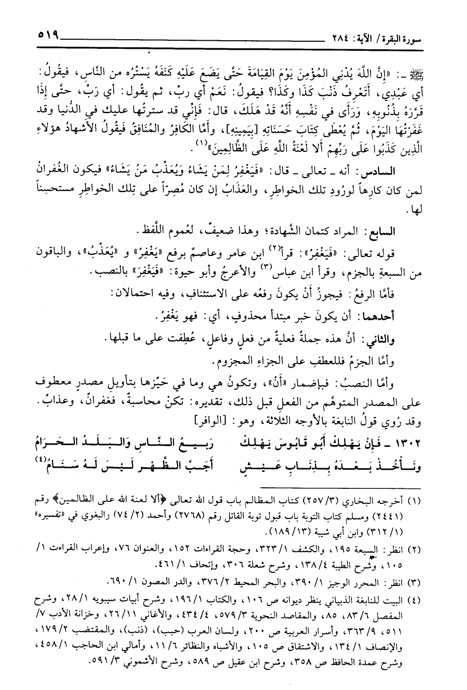 وأمَّا النصبُ: فبإضمار «أَنْ» ، وتكونُ هي وما في حَيِّزها بتأويلِ مصدرٍ معطوف على المصدر المتوهِّم من الفعلِ قبل ذلك، تقديره: تكنْ محاسبةُ، فغفرانٌ، وعذابٌ. وقد رُوي قولُ النابغة بالأوجه الثلاثة، وهو: [الوافر]
