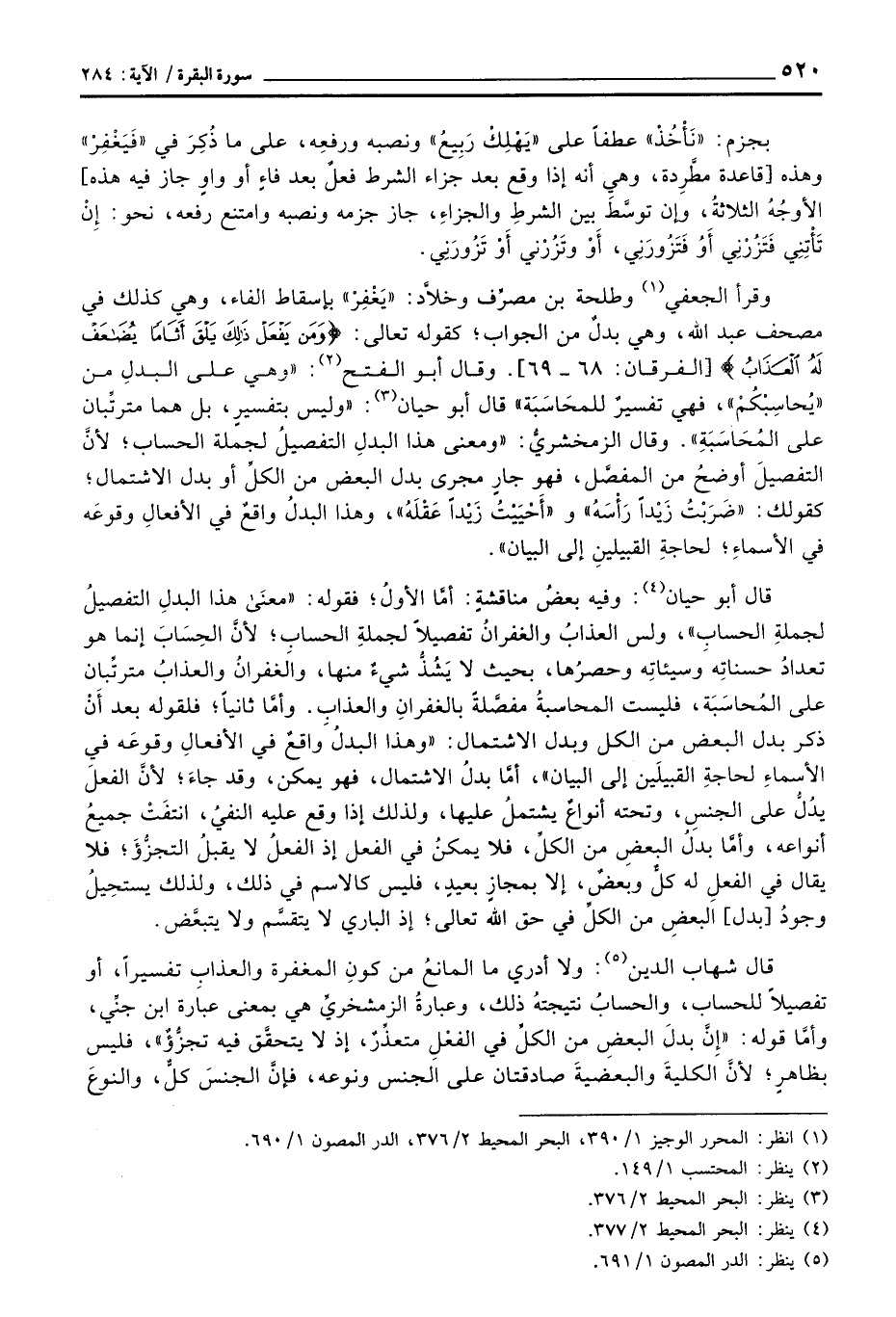 قال أبو حيان: وفيه بعضُ مناقشةٍ: أمَّا الأولُ؛ فقوله: «معنَى هذا البدلِ التفصيلُ لجملةِ الحسابِ» ، ولس العذابُ والغفرانُ تفصيلاً لجملةِ الحسابِ؛ لأنَّ الحِسَابَ إنما هو تعدادُ حسناتِه وسيئاتِه وحصرُها، بحيث لا يَشُذُّ شيءٌ منها، والغفرانُ والعذابُ مترتِّبان على المُحاسَبَة، فليست المحاسبةُ مفصَّلةٌ بالغفرانِ والعذابِ. وأمَّا ثانياً؛ فلقوله بعد أَنْ ذكر بدل البعض من الكل وبدل الاشتمال: «وهذا البدلُ واقعٌ في الأفعالِ وقوعَه في الأسماءِ لحاجةِ القبيلَين إلى البيان» ، أمَّا بدلُ الاشتمال، فهو يمكن، وقد جاءَ؛ لأنَّ الفعلَ يدُلُّ على الجنسِ، وتحته أنواعٌ يشتملُ عليها، ولذلك إذا وقع عليه النفيُ، انتفَتْ جميعُ أنواعه، وأمَّا بدلُ البعضِ من الكلِّ، فلا يمكنُ في الفعل إذ الفعلُ لا يقبلُ التجزُّؤَ؛ فلا يقال في الفعلِ له كلٌّ وبعضٌ، إلا بمجازٍ بعيدٍ، فليس كالاسم في ذلك، ولذلك يستحِيلُ وجودُ [بدل] البعضِ من الكلِّ في حق الله تعالى؛ إذ الباري لا يتقسَّم ولا يتبعَّض.