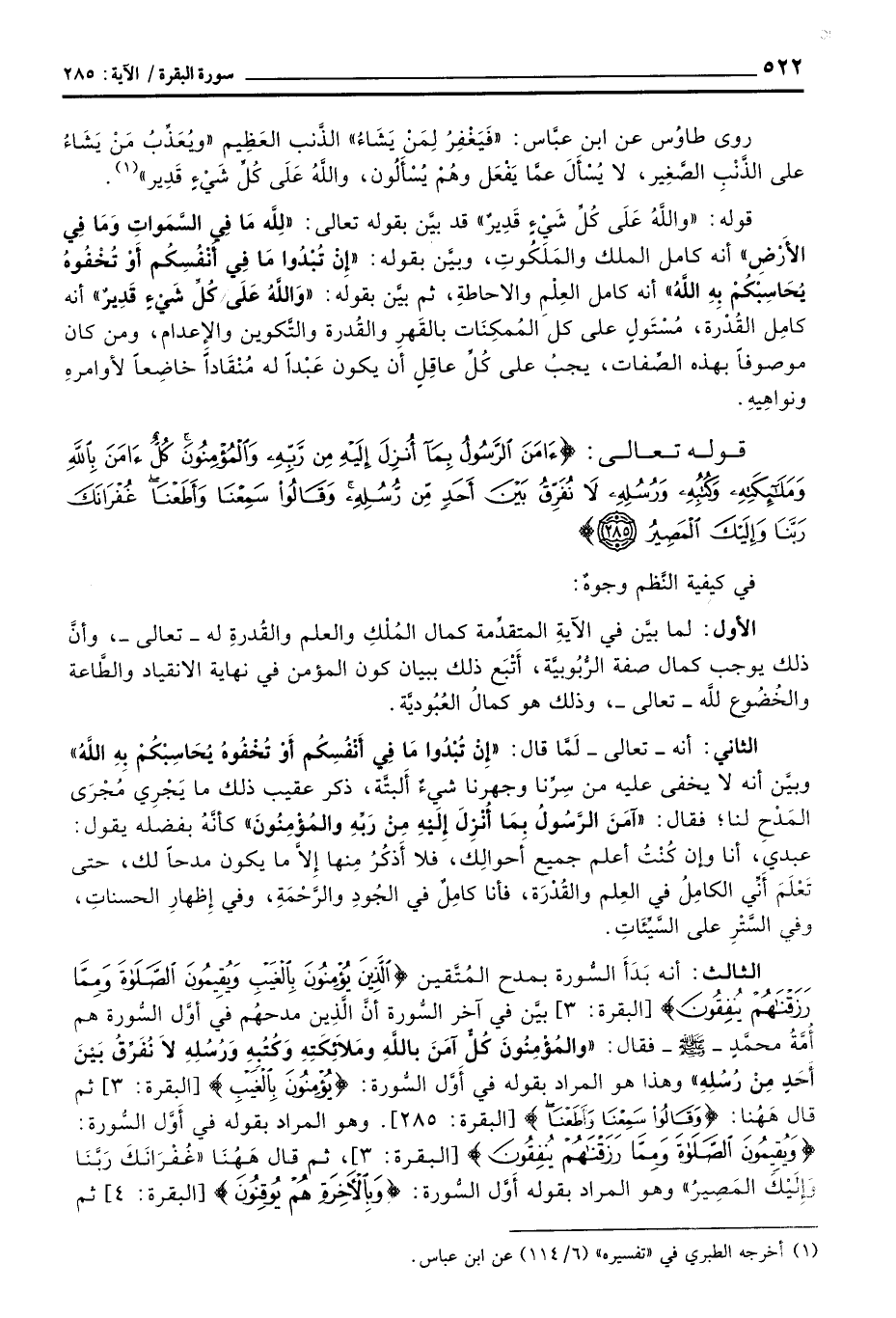 روى طاوُس عن ابنِ عبَّاس: «فَيَغْفِرُ لِمَنْ يَشَاءُ» الذَّنب العَظِيم «ويُعَذِّبُ مَنْ يَشَاءُ على الذَّنْبِ الصَّغِير، لا يُسْأَلَ عمَّا يَفْعَل وهُمْ يُسْأَلُون، واللهُ عَلَى كُلِّ شَيْءٍ قَدِير» .