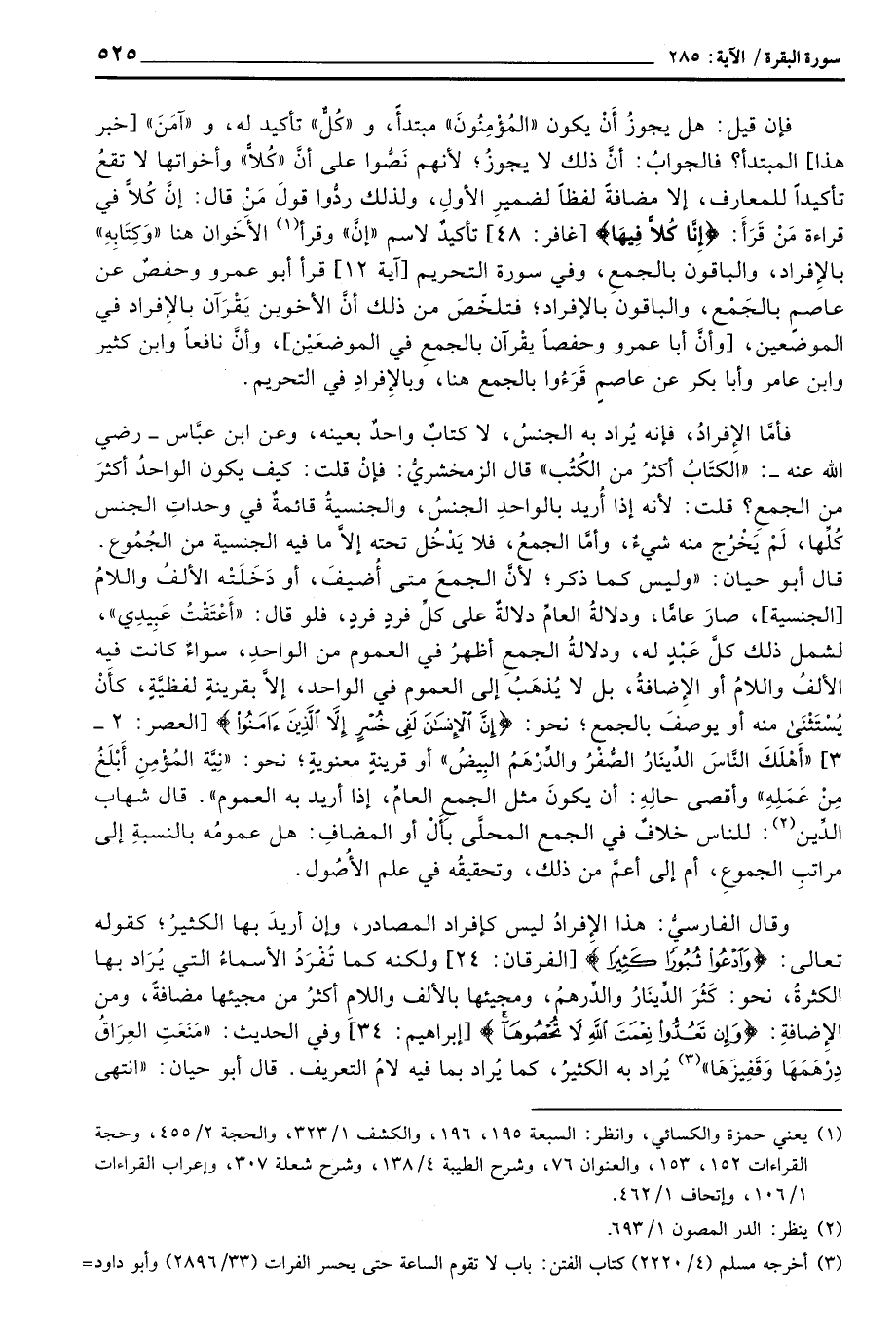 فأمَّا الإِفرادُ، فإنه يُراد به الجنسُ، لا كتابٌ واحدٌ بعينه، وعن ابن عبَّاس - رَضِيَ اللَّهُ عَنْه -: «الكتَابُ أكثرُ من الكُتُب» قال الزمخشريُّ: فإنْ قلت: كيف يكون الواحدُ أكثرَ من الجمعِ؟ قلت: لأنه إذا أُريد بالواحدِ الجنسُ، والجنسيةُ قائمةٌ في وحداتِ الجنس كُلِّها، لَمْ يَخْرُج منه شيءٌ، وأمَّا الجمعُ، فلا يَدْخُل تحته إلاَّ ما فيه الجنسية من الجُمُوع. قال أبو حيان: «وليس كما ذكر؛ لأنَّ الجمعَ متى أُضيفَ، أو دَخَلَتْه الألفُ واللامُ [الجنسية] ، صارَ عامّاً، ودلالةُ العامِّ دلالةٌ على كلِّ فردٍ فردٍ، فلو قال:» أَعْتَقْتُ عَبِيدِي «، لشمل ذلك كلَّ عَبْدٍ له، ودلالةُ الجمعِ أظهرُ في العموم من الواحدِ، إلاَّ بقرينةٍ لفظيَّةٍ، كأَنْ يُسْتَثْنَى منه أو يوصفَ بالجمع؛ نحو: {إِنَّ الإنسان لَفِى خُسْرٍ إِلاَّ الذين آمَنُواْ}