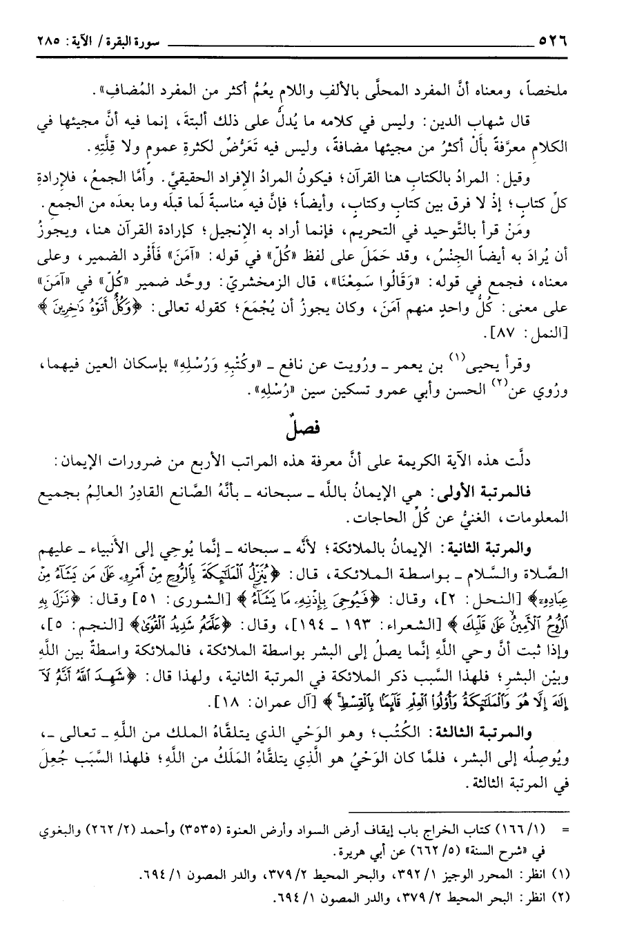 وقيل: المرادُ بالكتابِ هنا القرآن؛ فيكونُ المرادُ الإِفراد الحقيقيَّ. وأمَّا الجمعُ، فلإِرادةِ كلِّ كتابٍ؛ إذْ لا فرق بين كتابٍ وكتابٍ، وأيضاً؛ فإنَّ فيه مناسبةً لَما قبلَه وما بعدَه من الجمعِ.