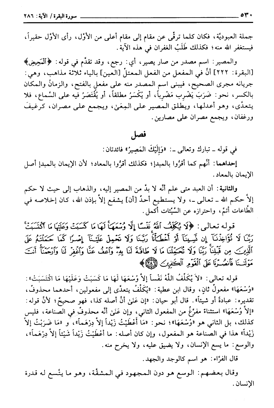 قوله تعالى: {لاَ يُكَلِّفُ الله نَفْساً إِلاَّ وُسْعَهَا لَهَا مَا كَسَبَتْ ربنا لا تؤاخذنا إن نسينا أو أخطأنا ربنا ولا تحمل علينا إصرا كما حملته على الذين من قبلنا ربنا ولا تحملنا ما لا طاقة لنا به واعف عنا واغفر لنا وارحمنا أنت مولانا فانصرنا على القوم الكافرين} قوله تعالى: " لا يكلف الله نفسا إلا وسعها لها ما كسبت وعليها ما اكتسبت} : «وُسْعَهَا» مفعولٌ ثانٍ، وقال ابن عطية: «يُكَلِّفُ يتعدَّى إلى مفعولين، أحدهما محذوفٌ، تقديره: عبادةً أو شيئاً» . قال أبو حيان: «إن غَنَى أنَّ أصله كذا، فهو صحيحٌ؛ لأنَّ قوله:» إِلاَّ وُسْعَهَا «استثناءٌ مفرَّغٌ من المفعول الثاني، وإن عَنَى أنَّ أصله كذا، فهو صحيحٌ؛ لأنَّ قوله:» إِلاَّ وُسْعَهَا «استثناءٌ مفرَّغٌ من المفعول الثاني، وإن عَنَى أنَّه محذوفٌ في الصنعة، فليس كذلك، بل الثاني هو» وُسْعَهَا «؛ نحو:» مَا أَعْطَيْتُ زَيْداً إِلاَّ دِرْهَماً «، و» مَا ضَرَبْتُ إِلاَّ زَيْداً «هذا في الصناعة هو المفعول، وإن كان أصله: ما أعْطَيْتُ زَيْداً شَيْئاً إِلاَّ دِرْهَماً» ، والوسع: ما يسع الإنسان، ولا يضيق عليه، ولا يخرج منه. قال الفرَّاء: هو اسم كالوجد والجهد. وقال بعضهم: الوسع هو هدون المجهود في المشقَّة، وهو ما يتَّسع له قدرة الإنسان.