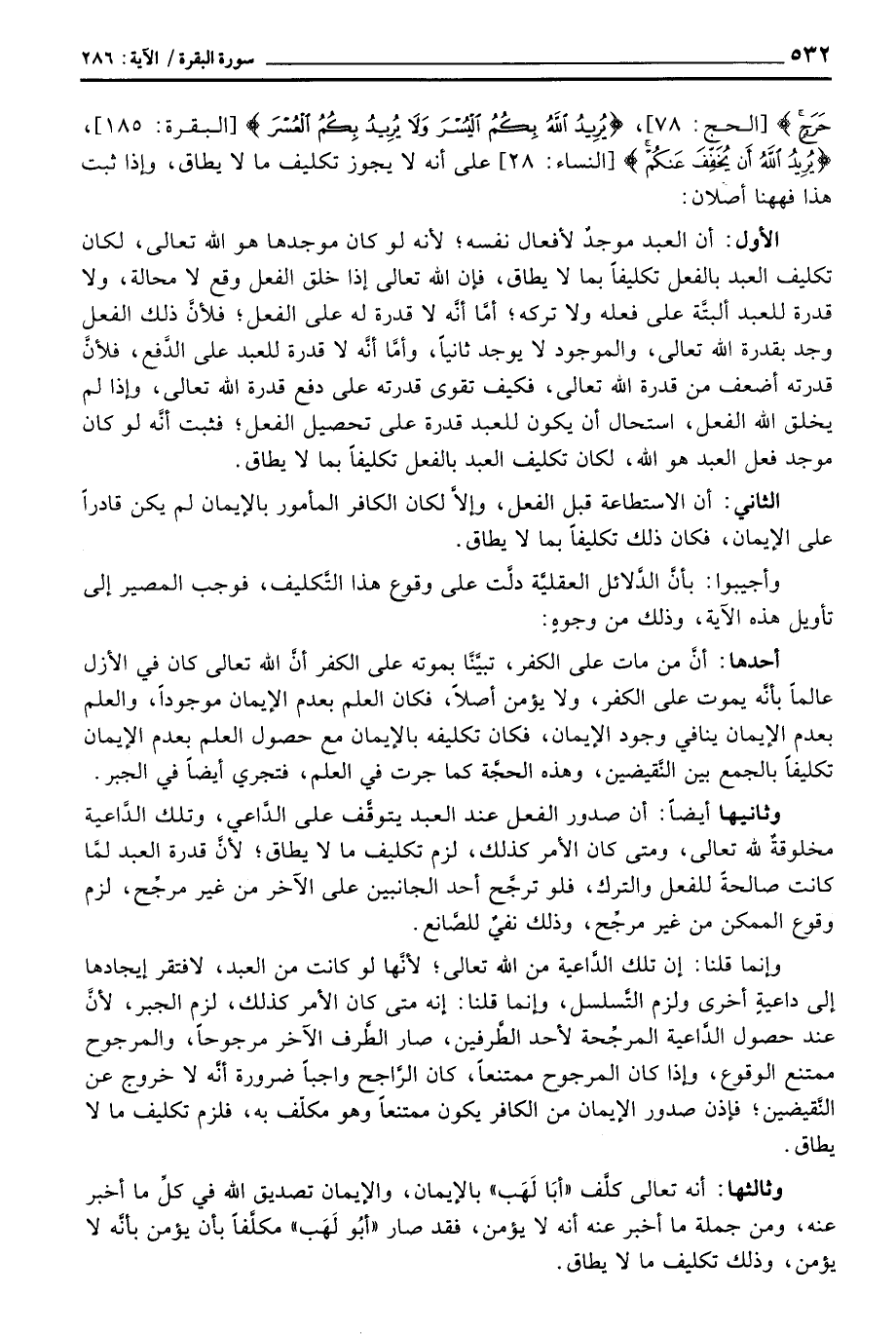 حَرَجٍ} [الحج: 78] ، {يُرِيدُ الله بِكُمُ اليسر وَلاَ يُرِيدُ بِكُمُ العسر} [البقرة: 185] ، {يُرِيدُ الله أَن يُخَفِّفَ عَنْكُمْ} [النساء: 28] على أنه لا يجوز تكليف ما لا يطاق، وإذا ثبت هذا فههنا أصلان: