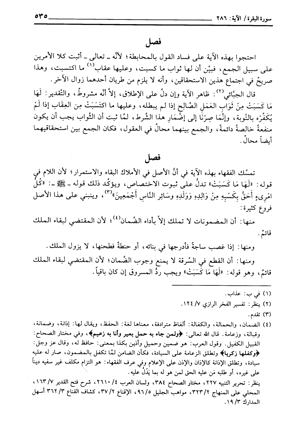 قال الجبَّائي: ظاهر الآية وإن دلَّ على الإطلاق، إلاَّ أنَّه مشروطٌ، والتَّقدير: لَهَا مَا كَسَبَتْ مِنْ ثَوَابِ العَمَلِ الصَّالِح إذا لم يبطله، وعليها ما اكتَسَبَتْ مِن العَقَاب إذا لَمْ يُكَفِّرْه بالتَّوبة، وإنَّمَا صِرْنَا إلى إضْمَارِ هذا الشَّرط، لمَّا ثبت أن الثَّواب يجب أن يكون منفعةً خالصةً دائمةً، والجمع بينهما محالٌ في العقول، فكان الجمع بين استحقاقيهما أيضا محالٌ.