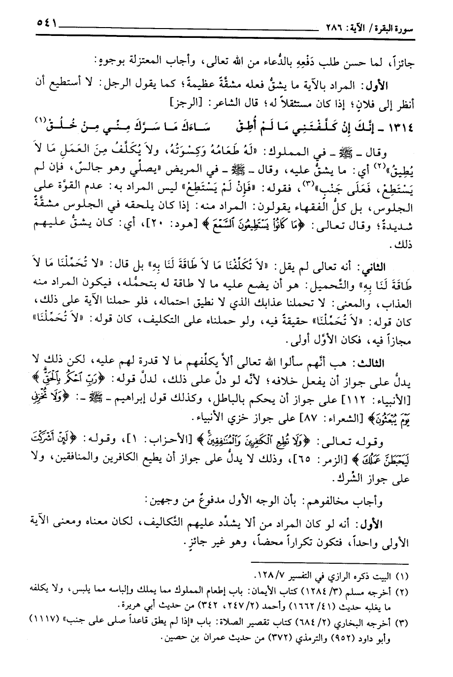 الثاني: أنه تعالى لم يقل: «لاَ تُكَلِّفْنَا مَا لاَ طَاقَةَ لَنَا بِهِ» بل قال: {لاَ تُحَمِّلْنَا مَا لاَ طَاقَةَ لَنَا بِهِ} والتَّحميل: هو أن يضع عليه ما لا طاقة له بتحمُّله، فيكون المراد منه العذاب، والمعنى: لا تحملنا عذابك الذي لا نطيق احتماله، فلو حملنا الآية على ذلك، كان قوله: «لاَ تُحَمِّلْنَا» حقيقةً فيه، ولو حملناه على التكليف، كان قوله: «لاَ تُحَمِّلْنَا» مجازاً فيه، فكان الأوَّل أولى.