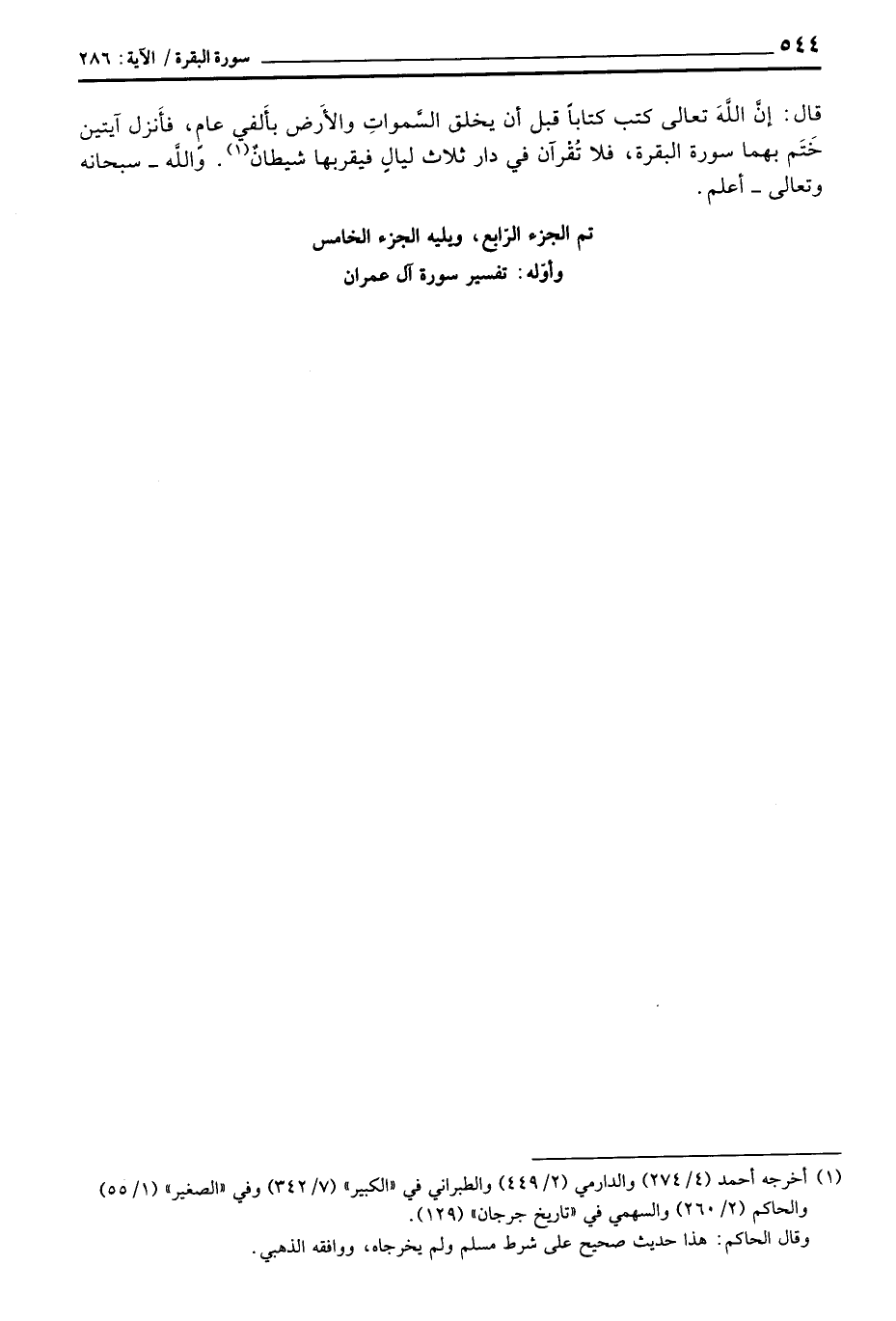 قال: «إنَّ اللهَ تعالى كتب كتاباً قبل أن يخلق السَّمواتِ والأَرض بأَلفي عام، فأَنزل آيتين خَتَم بهما سورة البقرة، فلا تُقْرآن في دار ثلاث ليالٍ فيقربها شيطانٌ» والله - سبحانه وتعالى - أعلم.