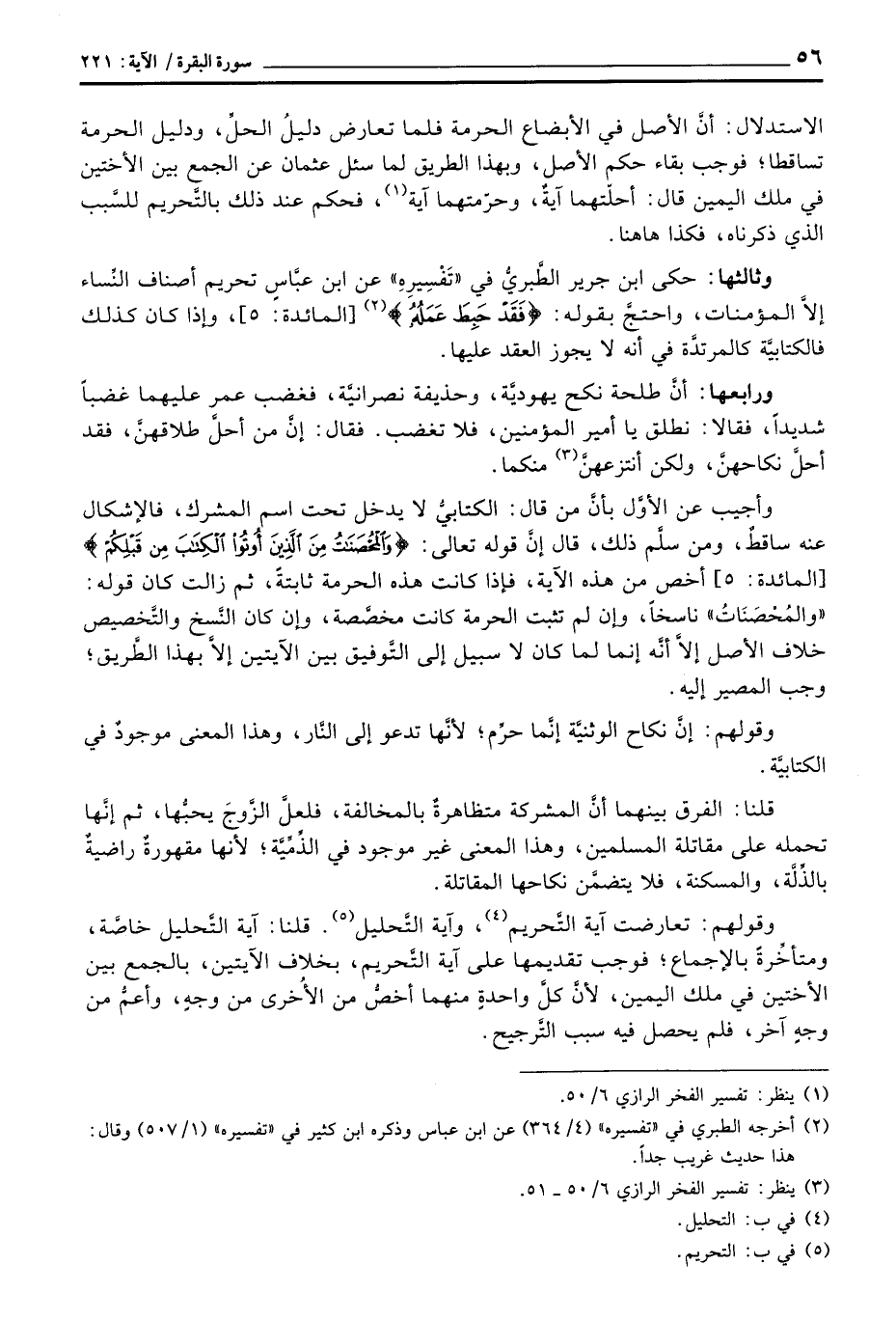 وأجيب عن الأوَّل بأنَّ من قال: الكتابيُّ لا يدخل تحت اسم المشرك، فالإشكال عنه ساقطٌ، ومن سلَّم ذلك، قال إنَّ قوله تعالى: {والمحصنات مِنَ الذين أُوتُواْ الكتاب مِن قَبْلِكُمْ} [المائدة: 5] أخص من هذه الآية، فإذا كانت هذه الحرمة ثاتبةً، ثم زالت كان قوله: «والمُحْصَنَاتُ» ناسخاً، وإن لم تثبت الحرمة كانت مخصَّصة، وإن كان النَّسخ والتَّخصيص خلاف الأصل إلاَّ أنَّه إنما لما كان لا سبيل إلى التَّوفيق بين الآيتين إلاَّ بهذا الطَّريق؛ وجب المصير إليه.