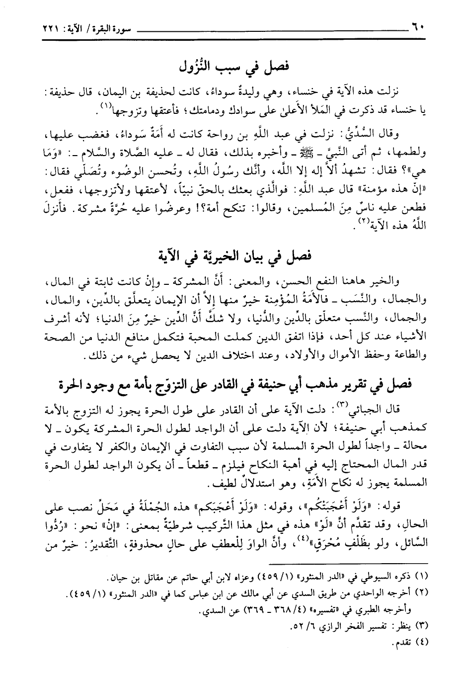 والخير ها هنا النفع الحسن، والمعنى: أَنَّ المشركة - وإِنْ كانت ثابتة في المال، والجمال، والنَّسَب - فالأَمَةُ المُؤْمِنة خيرٌ منها إِلاَّ أن الإيمان يتعلَّق بالدِّين، والمال، والجمال، والنَّسب متعلّق بالدِّين والدُّنيا، ولا شكَّ أَنَّ الدِّين خيرٌ مِنَ الدنيا؛ لأنه أشرف الأشياء عند كل أحد، فإذا اتفق الدين كملت المحبة فتكمل منافع الدنيا من الصحة والطاعة وحفظ الأموال والأولاد، وعند اختلاف الدين لا يحصل شيء من ذلك.