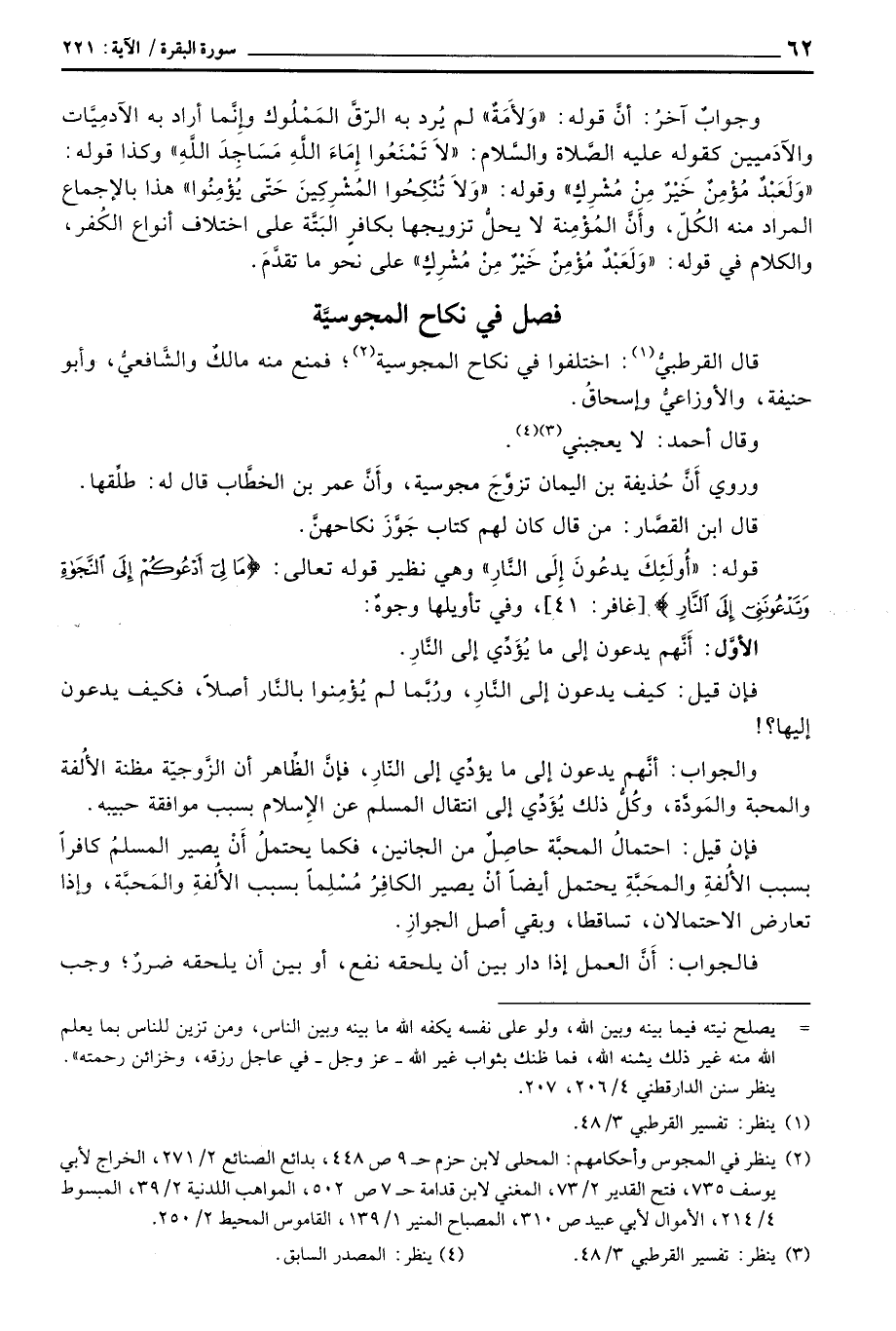 قال القرطبيُّ: اختلفوا في نكاح المجوسية؛ فمنع منه مالكٌ والشَّافعيُّ، وأبو حنيفة، والأوزاعيُّ وإسحاقُ.