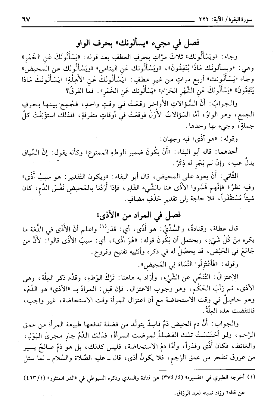 قال عطاءٌ، وقتادةٌ، والسُّدِّيُّ: هو أَذًى، أي: قذر واعلم أَنَّ الأَذَى في اللُّغة ما يكره مِنْ كُلِّ شَيْءٍ، ويحتمل أن يَكُونَ قوله: {هُوَ أَذًى} ، أي: سببُ الأَذَى قالوا: لأَنَّ من جَامَعَ في الحَيْض، قد يحصُلُ له في ذكره وأنثييه تفتيح وقروح.