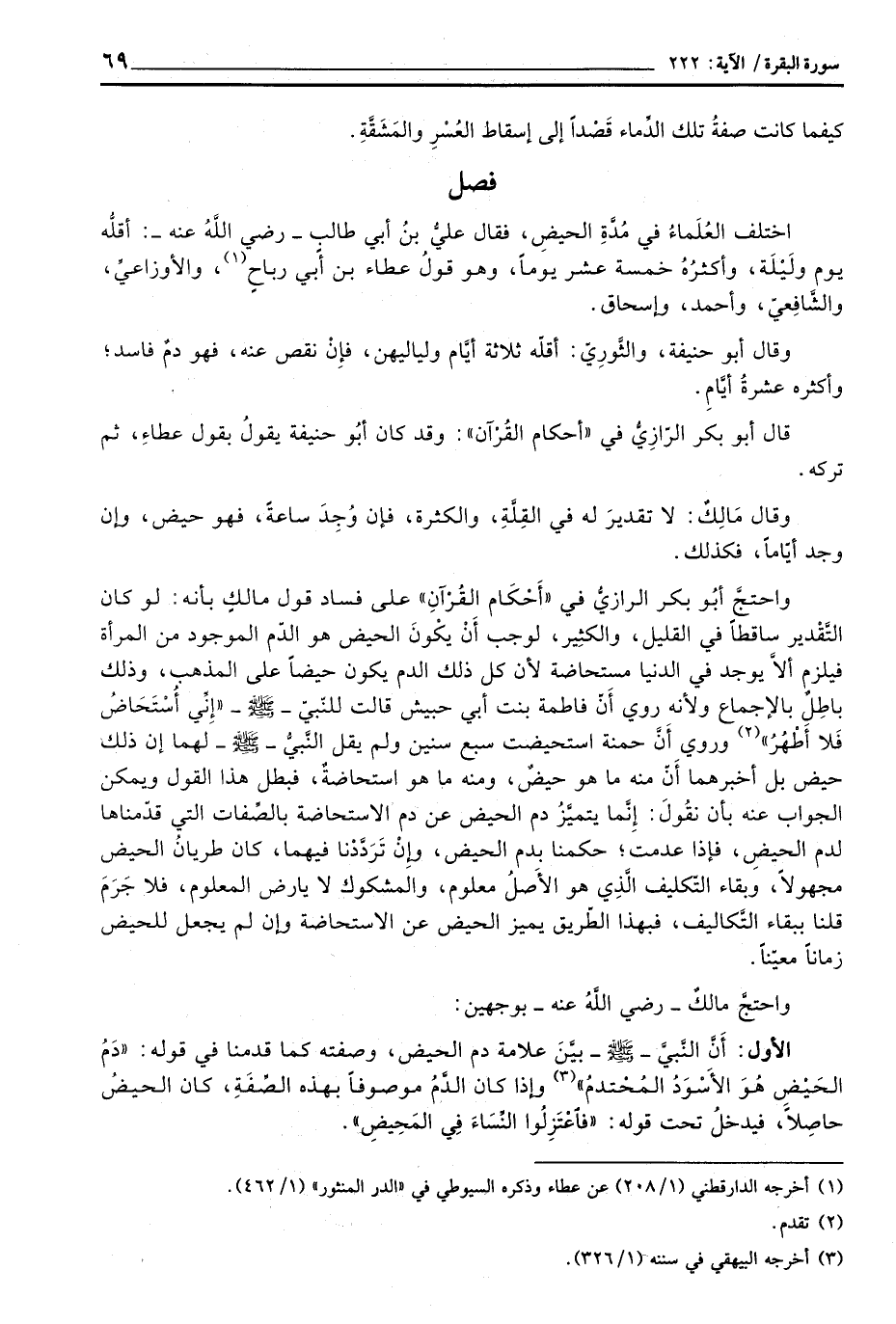 واحتجَّ أبُو بكر الرازيُّ في «أَحْكَامِ القُرْآنِ» على فساد قول مالكٍ بأنه: لو كان التَّقْدير ساقطاً في القليل، والكثِير، لوجب أَنْ يكُونَ الحيض هو الدّم الموجود من المرا’ فيلزم ألاَّ يوجد في الدنيا مستحاضة لأن كل ذلك الدم يكون حيضاً على المذهب، وذلك باطِلٌ بالإجماع ولأنه روي أَنّ فاطمة بنت أبي حبيش قالت للنّبيّ - صَلَّى اللَّهُ عَلَيْهِ وَسَلَّم َ - «إِنِّي أُسْتَحَاضُ فَلا أَطْهُرُ» وروي أَنّ منه ما هو حيضٌ، ومنه ما هو استحاضةٌ، فبطل هذا القول ويمكن الجواب عنه بأن نقُولَ: إِنَّما يتميَّزُ دم الحيض عن دم الاستحاضة بالصِّفات التي قدّمناها لدم الحيضِ، فإذا عدمت؛ حكمنا بدم الحيض، وإِنْ تَرَدَّدْنا فيهما، كان طريانُ الحيض مجهولاً، وبقاء التّكليف الَّذِي هو الأَصلُ معلوم، والمشكوك لا يارض المعلوم، فلا جَرَمَ قلنا ببقاء التَّكاليف، فبهذا الطّريق يميز الحيض عن الاستحاضة وإن لم يجعل للحيض زماناً معيّناً.