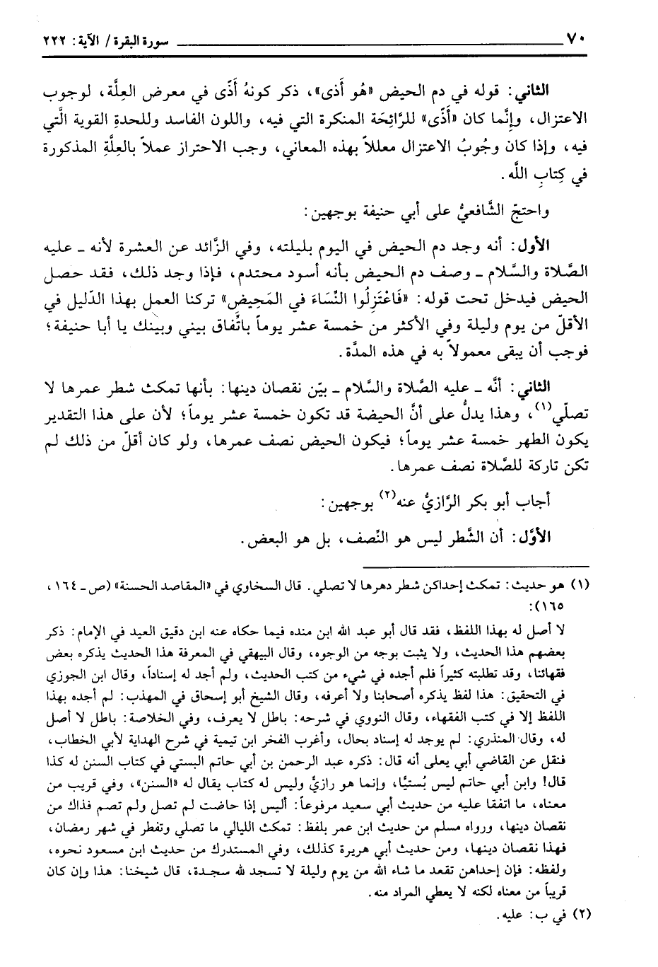 الثاني: قوله في دم الحيض «هُو أَذى» ، ذكر كونهُ أَذًى في معرض العِلَّة، لوجوب الاعتزال، وإِنَّما كان «أَذًى» للرَّائِحَة المنكرة التي فيه، واللون الفاسد وللحدةِ القوية الَّتي فيه، وإذا كان وجُوبُ الاعتزال معللاً بهذه المعاني، وجب الاحتراز عملاً بالعِلَّةِ المذكورة في كِتابِ الله.