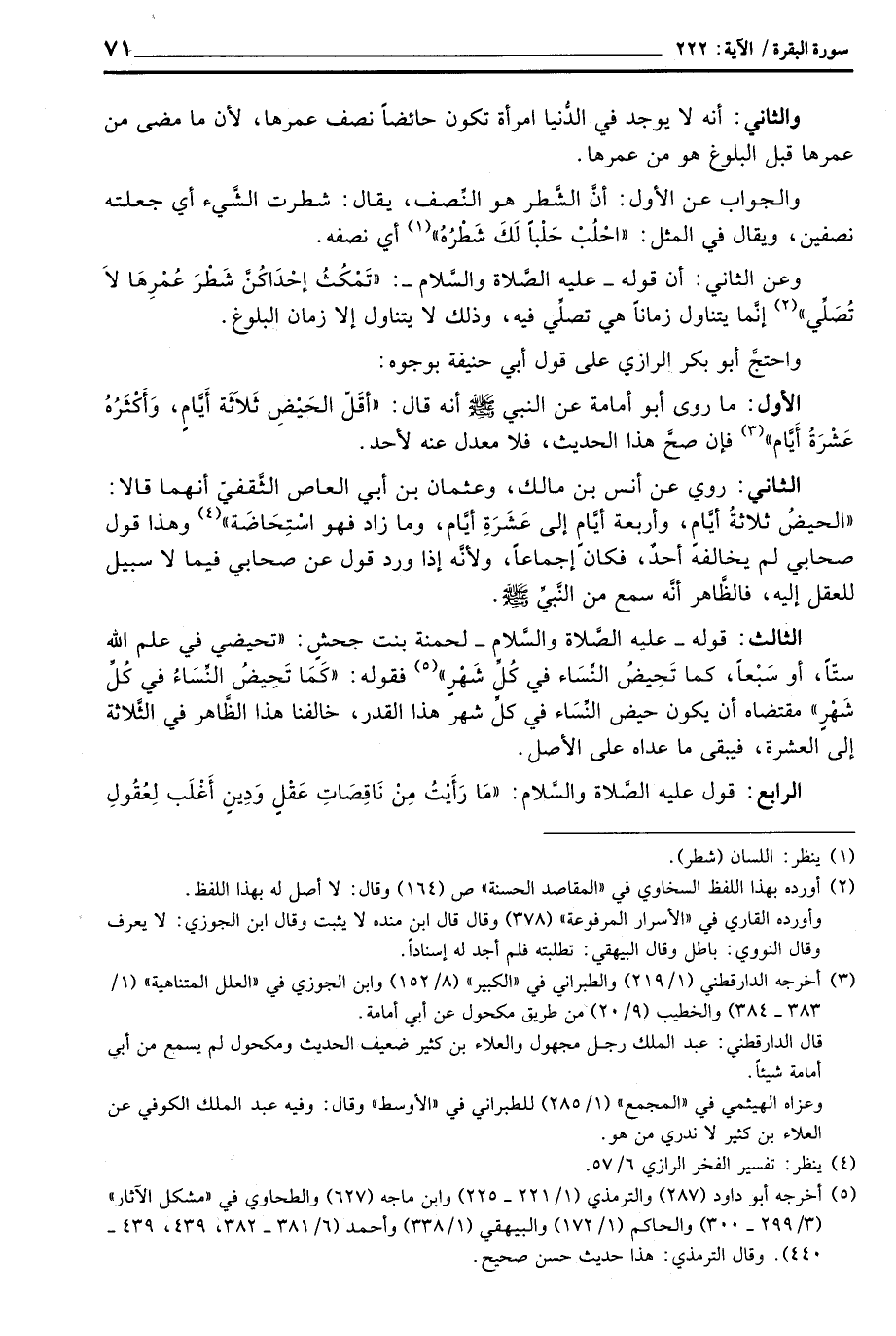 الثالث: قوله - عليه الصَّلاة والسَّلام - لحمنه بنت جحش: «تحيضي في علم الله ستّاً، أو سَبْعاً، كما تَحِيضُ النِّسَاء في كُلِّ شَهْرٍ» فقوله: «كَمَا تَحِيضُ النِّسَاءُ في كُلِّ شَهْرٍ» مقتضاه أن يكون حيض النِّسَاء في كلِّ شهر هذا القدر، خالفنا هذا الظَّاهر في الثَّلاثة إلى العشرة، فيبقى ما عداه على الأصل.