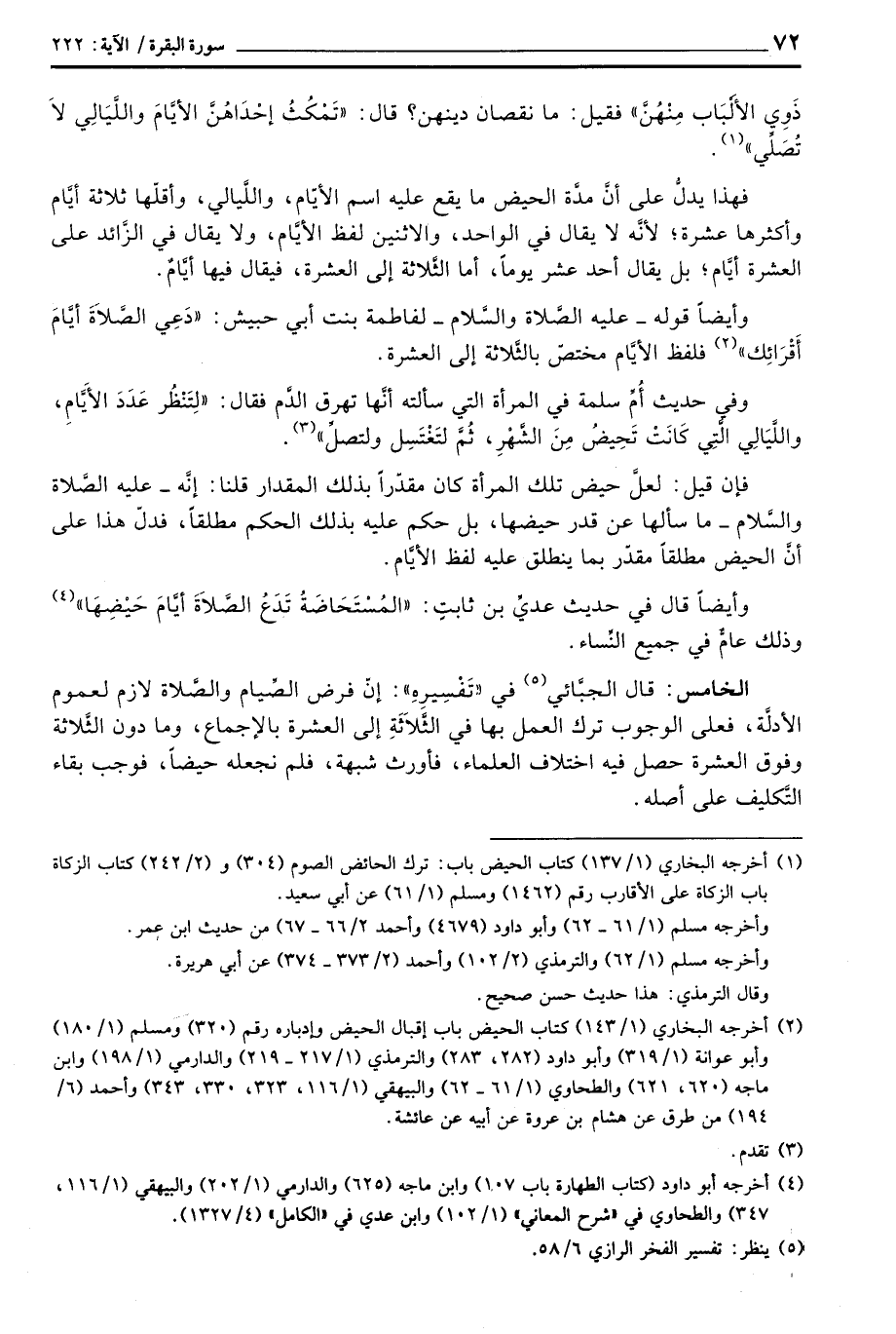 الخامس: قال الجبَّائي في «تَفْسِيرِهِ» إنّ فرض الصِّيام والصَّلاة لازم لعموم الأدلَّة، فعلى الوجوب ترك العمل بها في الثَّلاثَةَ إلى العشرة بالإجماع، وما دون الثَّلاثة وفوق العشرة حصل فيه اختلاف العلماء، فأورث شبهة، فلم نجعله حيضاً، فوجب بقاء التَّكليف على أصله.