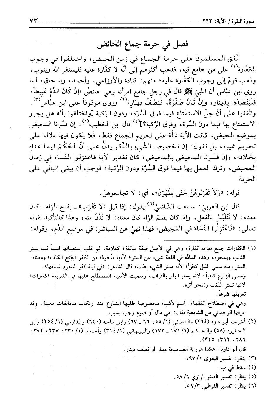 «إنْ كَانَ الدَّمُ عَبِيطاً؛ فَلْيَتَصَدّق بِدينَار، وإِنْ كَانَ صُفْرَةٌ، فَنِصْفُ دِينَارٍ» وروي موقوفاً على ابن عبَّاس. واتَّفقوا على أنَّ جلّ الاستمتاع فيما فوق السُّرَّة، ودون الرُّكبة [واختلفوا بأنّه هل يجوز الاستمتاع بها فيما دون السُّرة، وفوق الرُّكبة؟] قال ابن الخطيب: إن فسَّرنا المحيض بموضع الحيض، كانت الآية دالّة على تحريم الجماع فقط، فلا يكون فيها دلالة على تحريم غيره، بل نقول: إنّ تخصيص الشَّيءِ بالذّكر يدلُّ على أنَّ الحُكْمَ فيما عداه بخلافه، وإن فسَّرنا المحيض بالمحيض، كان تقدير الآية فاعتزلوا النِّساء في زمان المحيض، وترك العمل بها فيما فوق السُّرَّة ودون الرُّكبة؛ فوجب أن يبقى الباقي على الحرمة.