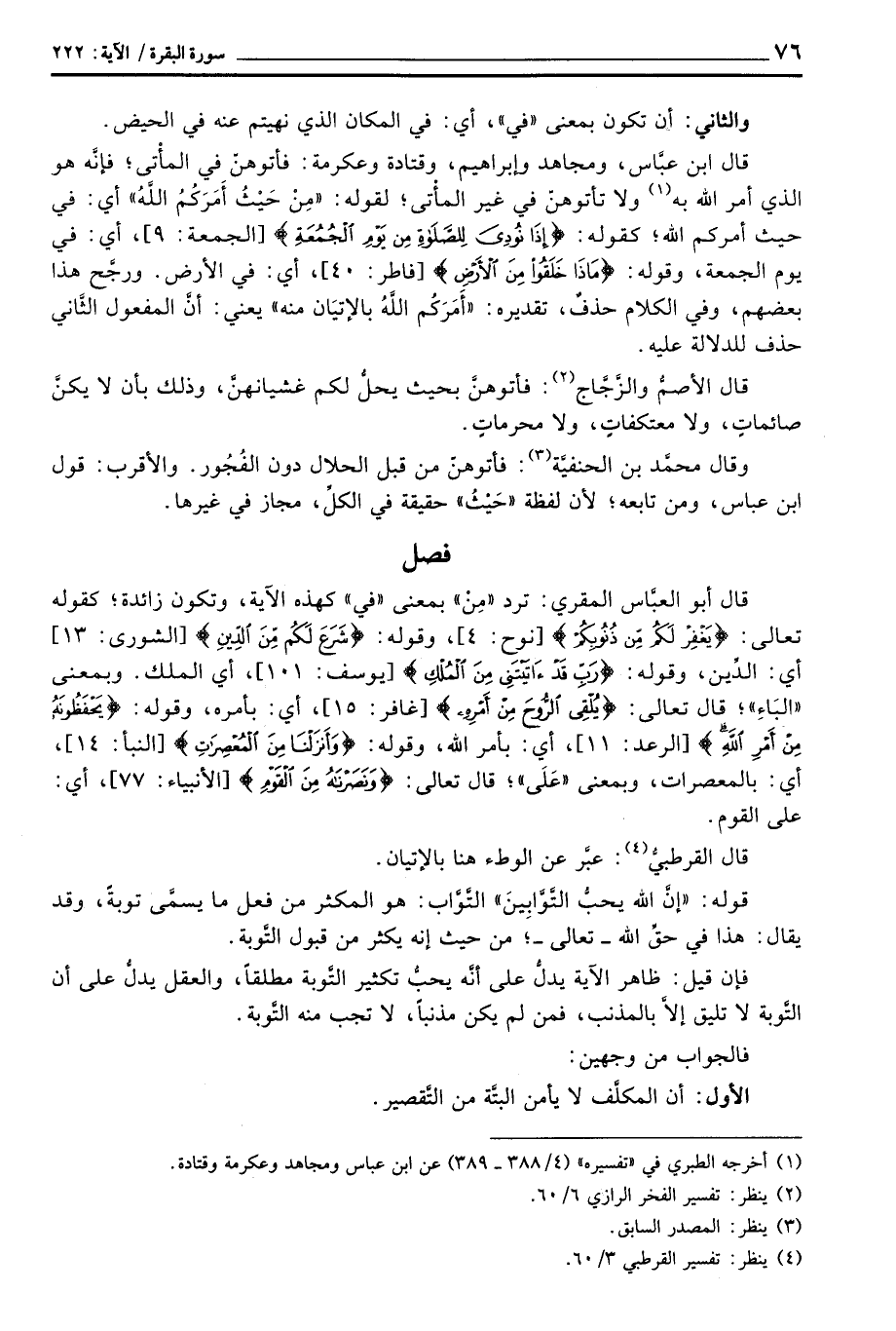 وقال محمَّد بن الحنفيَّة: فأتوهنّ من قبل الحلال دون الفُجُور. والأقرب: قول ابن عباس، ومن تابعة؛ لأن لفظة «حَيْثُ» حقيقة في الكلِّ، مجاز في غيرها.