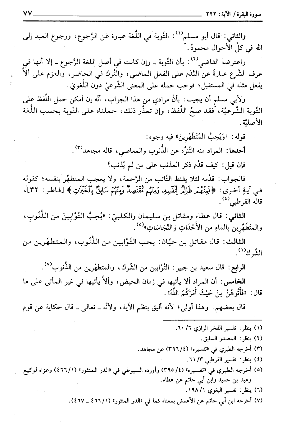 الثاني: قال عطاء ومقاتل بن سليمان والكلبيّ: «يُحِبُّ التَّوَّابِينَ من الذُّنُوبِ، والمتَطَهِّرِين بالمَاءِ من الأَحْدَاثِ والنَّجَاسَاتِ» .