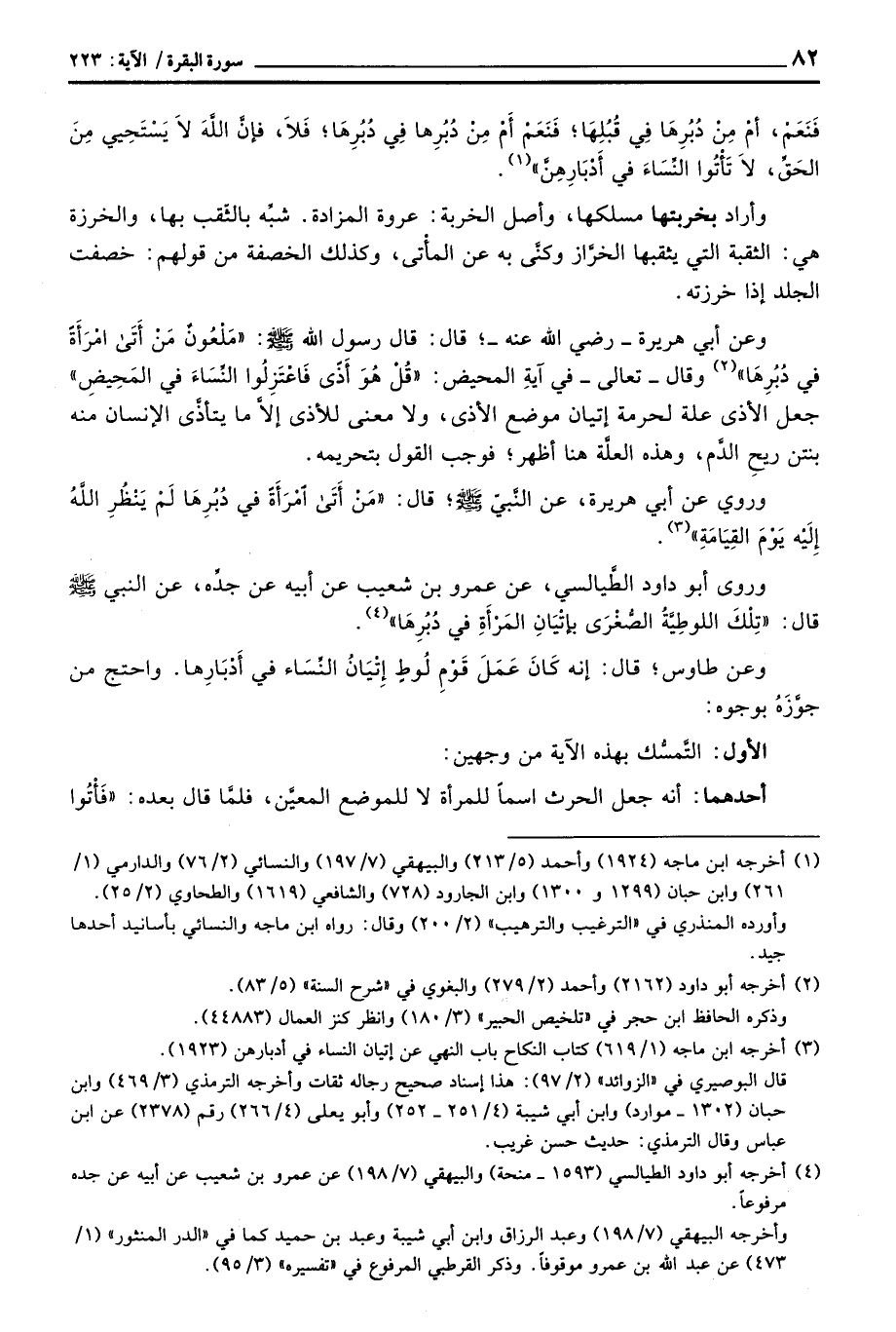 فَنَعَمْ، أمْ مِنْ دُبُرِهَا فِي قُبُلِهَا؛ فَنَعَمْ أَمْ مِنْ دُبُرِها فِي دُبُرِهَا، فَلاَ، فإنَّ اللهَ لاَ يَسْتَحيِي مِنَ الحَقِّ، لاَ تَأْتُوا النِّسَاءَ في أَدْبَارِهِنَّ» .