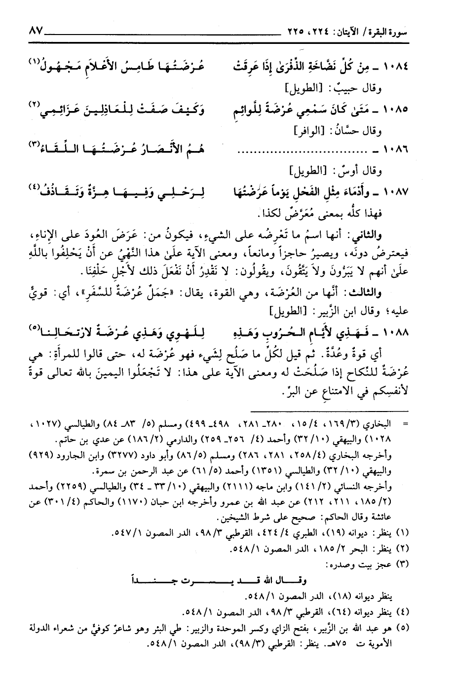 والثاني: أنها اسمُ ما تَعْرِضُه على الشيءِ، فيكونُ من: عَرَضَ العُودَ على الإِناءِ، فيعترضُ دونَه، ويصيرُ حاجزاً ومانعاً، ومعنى الآية علَى هذا النَّهيُ عن أَنْ يَحْلِفُوا باللهِ علَى أنَّهم لا يَبَرُّونَ ولاَ يَتَّقُونَ، ويقُولُون: لا نَقْدِرُ أَنْ نَفْعَلَ ذلك لأَجْلِ حَلْفِنَا.
