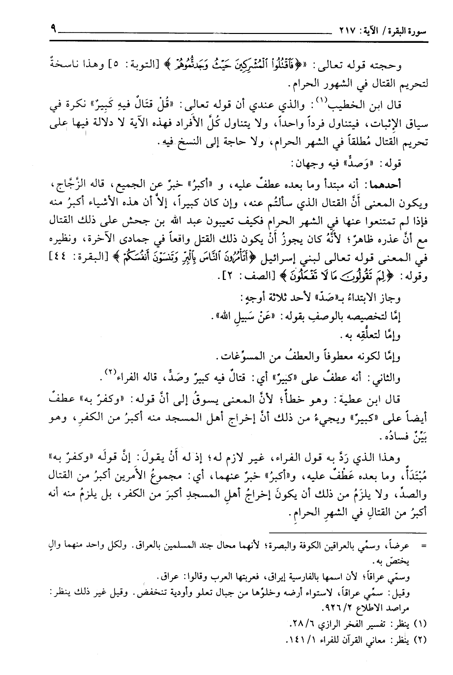 وهذا الذي رَدَّ به قول الفراء، غير لازم له؛ إذ له أَنْ يقولَ: إِنَّ قولَه «وكفرٌ به» مُبْتَدَأٌ، وما بعده عَطْفٌ عليه، و «أكبرُ» خبرٌ عنهما، أي: مجموعُ الأَمرين أكبرُ من القتال والصدِّ، ولا يلزَمُ من ذلك أن يكونَ إخراجُ أهلِ المسجدِ أكبرَ من الكفر، بل يلزمُ منه أنه أكبرُ من القتالِ في الشهرِ الحرامِ.