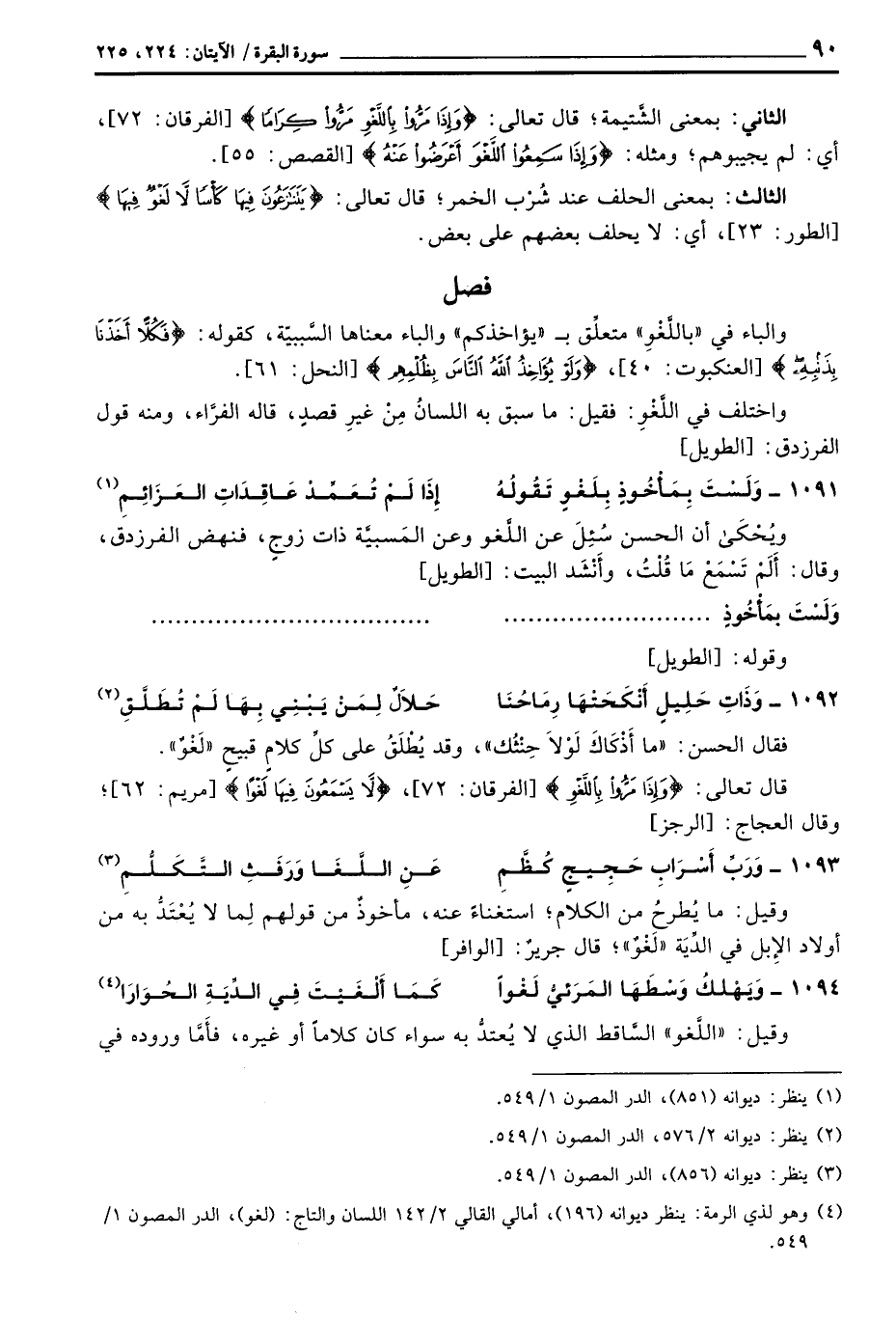 واختلف في اللَّغْوِ: فقيل: ما سبق به اللسانُ مِنْ غيرِ قصدٍ، قاله الفرَّاء، ومنه قول الفرزدق: [الطويل]