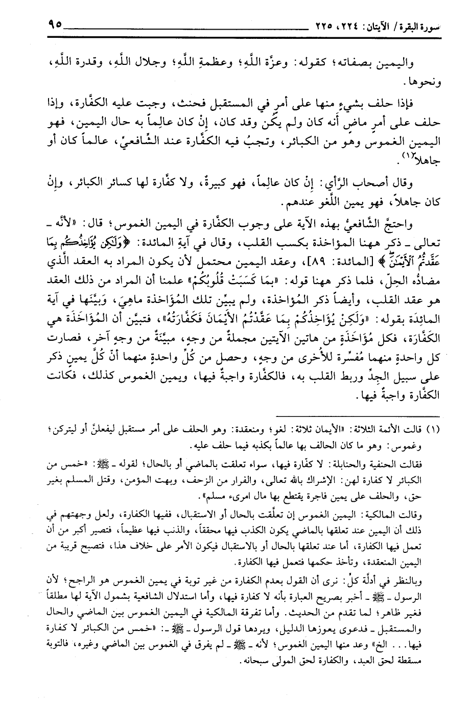 واحتجَّ الشَّافعيُّ بهذه الآية على وجوب الكفَّارة في اليمين الغموس؛ قال: «لأَنَّه - تعالى - ذكر ههنا المؤاخذة بكسب القلب، وقال في آيةِ المائدة: {ولكن يُؤَاخِذُكُم بِمَا عَقَّدتُّمُ الأيمان} [المائدة: 89] ، وعقد اليمين محتمل لأن يكون المراد به العقد الَّذي مضادُّه الحِلّ، فلما ذكر ههنا قوله: {بِمَا كَسَبَتْ قُلُوبُكُمْ} علمنا أن المراد من ذلك العقد هو عقد القلب، وأيضاً ذكر المُؤاخذة، ولم يبيِّن تلك المُؤاخذة ما هِيَ، وَبيَّنَها في آية المائِدَة بقوله: {ولكن يُؤَاخِذُكُم بِمَا عَقَّدتُّمُ الأيمان فَكَفَّارَتُهُ} [المائدة: 89] ، فتبيَّن أن المُؤَاخَذَة هي الكَفَّارَة، فكل مُؤَاخَذَةٍ من هاتين الآيتين مجملةٌ من وجهٍ، مبيَّنَةٌ من وجهٍ آخر، فصارت كل واحدةٍ منهما مُفسَّرة للأُخرى من وجهٍ، وحصل من كُلِّ واحدةٍ منهما أَنَّ كُلَّ يمينٍ ذكر على سبيل الجِدِّ وربط القلب به، فالكفَّارة واجبةٌ فيها، ويمين الغموس كذلك، فكانت الكفَّارة واجبةٌ فيها.