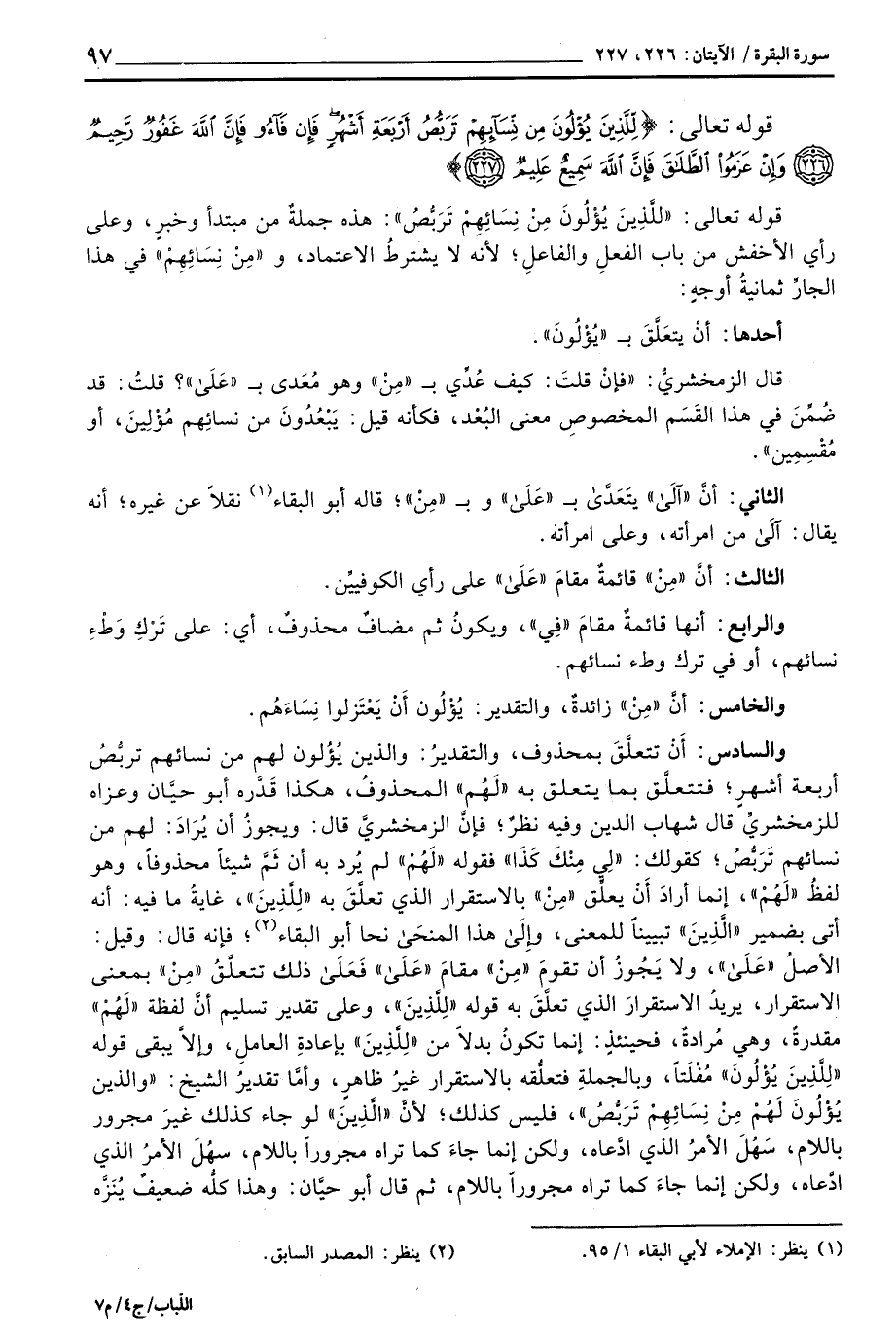 والسادس: أَنْ تتعلَّقَ بمحذوف، والتقديرُ: والذين يُؤُلون لهم من نسائهم تربُّصُ أربعة أشهرٍ؛ فتتعلَّق بما يتعلق به «لَهُم» المحذوفُ، هكذا قَدَّره أبو حيَّان وعزاه للزمخشريِّ قال شهاب الدين وفيه نظرٌ؛ فإنَّ الزمخشريَّ قال: ويجوزُ أن يُرَادَ: لهم من نسائهم تَرَبُّصُ؛ كقولك: «لِي مِنْكَ كَذَا» فقوله «لَهُمْ» لم يُرد به أن ثَمَّ شيئاً محذوفاً، وهو لفظُ «لَهُمْ» ، إنما أرادَ أَنْ يعلِّق «مِنْ» بالاستقرار الذي تعلَّق به «لِلَّذِينَ» ، غايةُ ما فيه: أنه أتى بضمير «الَّذِينَ» تبييناً للمعنى، وإِلَى هذا المنحَى نحا أبو البقاء؛ فإنه قال: وقيل: الأصلُ «عَلَى» ، ولا يَجُوزُ أن تقومَ «مِنْ» مقامَ «عَلَى» فَعَلَى ذلك تتعلَّقُ «مِنْ» بمعنى الاستقرار، يريدُ الاستقرارَ الذي تعلَّقَ به قوله «لِلَّذِينَ» ، وعلى تقدير تسليم أنَّ لفظة «لَهُمْ» مقدرةٌ، وهي مُرادةٌ، فحينئذٍ: إنما تكونُ بدلاً من «لِلَّذِينَ» بإِعادةِ العاملِ، وإلاَّ يبقى قوله «لِّلَّذِينَ يُؤْلُونَ» مُفْلَتاً، وبالجملةِ فتعلُّقه بالاستقرار غيرُ ظاهرٍ، وأمَّا تقديرُ الشيخ: «والذين يُؤْلُونَ مِن نِّسَآئِهِمْ تَرَبُّصُ» ، فليس كذلك؛ لأنَّ «الَّذِينَ» لو جاء كذلك غيرَ مجرور باللام، سَهُلَ الأمرُ الذي ادَّعاه، ولكن إنما جاءَ كما تراه مجروراً باللام، سهُلَ الأمرُ الذي ادَّعاه، ولكن إنما جاءَ كما تراه مجروراً باللام، ثم قال أبو حيَّان: وهذا كلُّه ضعيفٌ يُنَزَّه